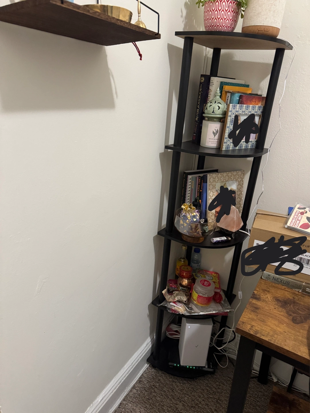 This is a black 5-tier corner shelf unit. It's great for organizing books and decor. The shelves are made of wood with woodsupports. It's an easy way to add storage to any corner!
