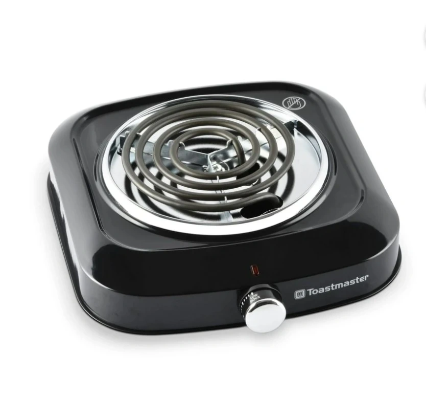 This is a black Toastmaster single burner electric stove. It has a metal coil heating element and adjustable temperature control with an indicator light. Useful for small kitchens or dorm rooms.