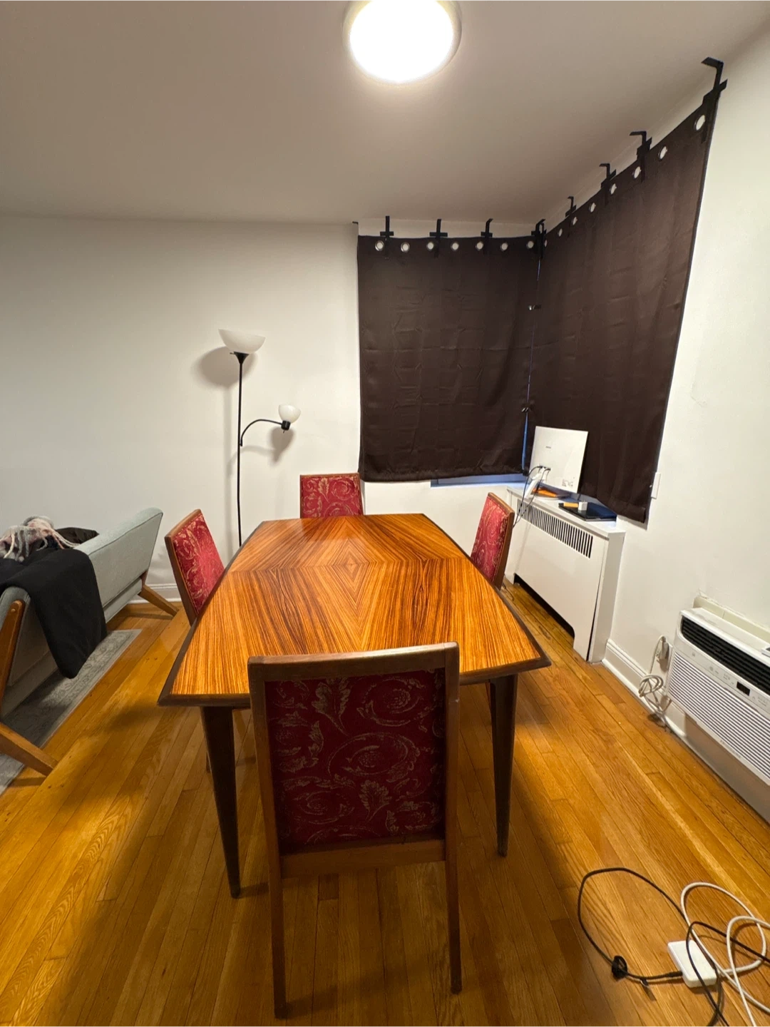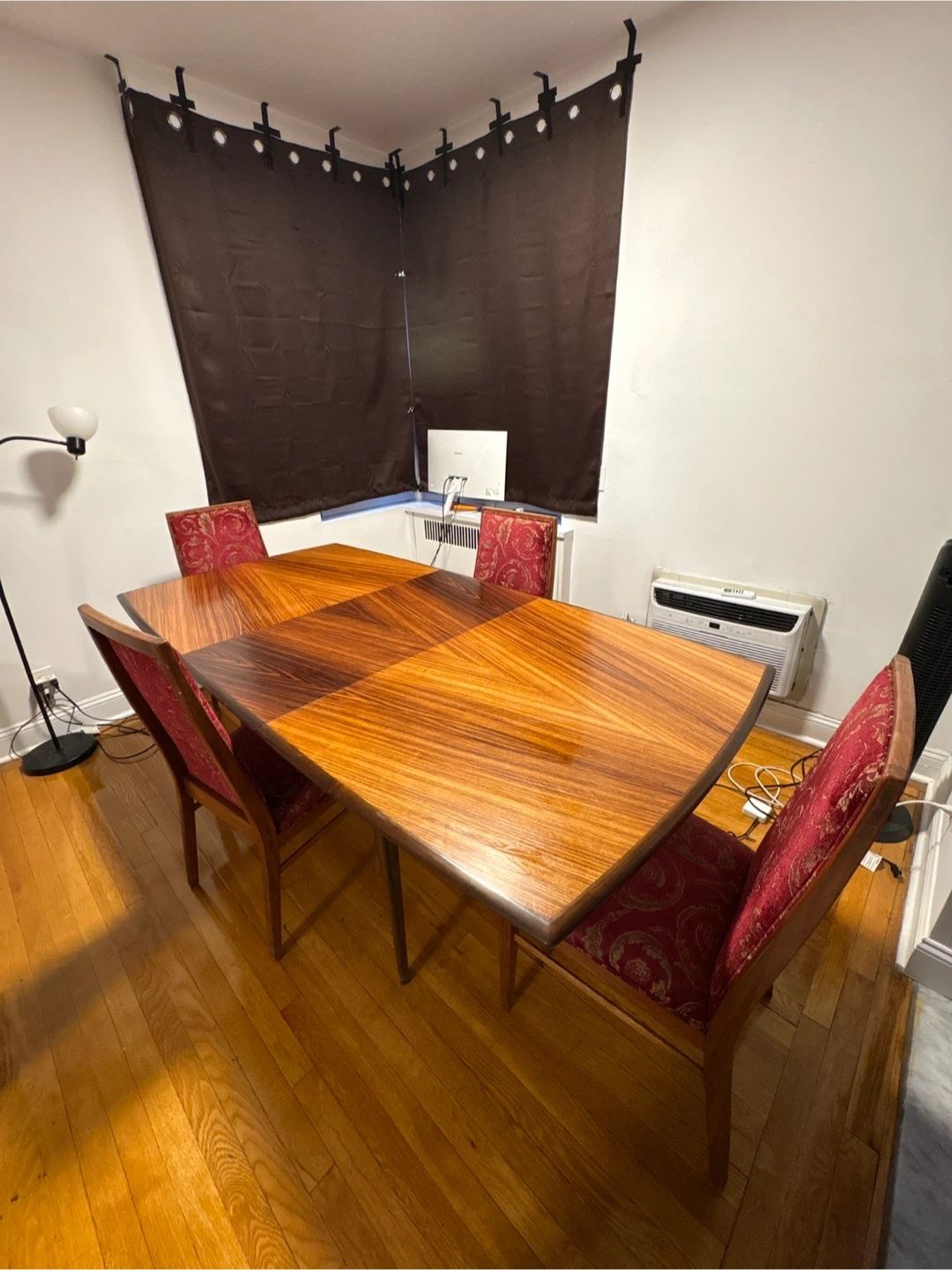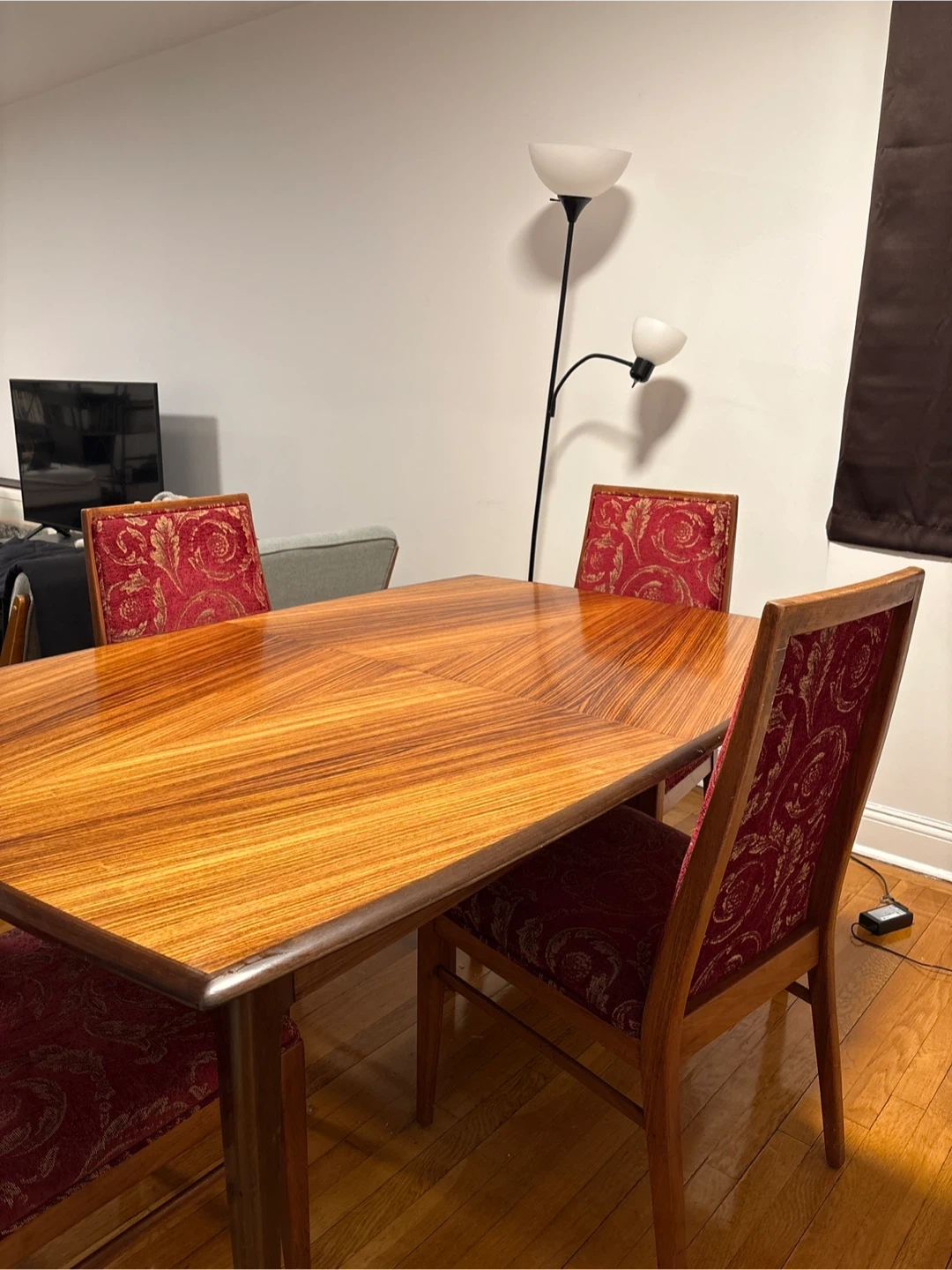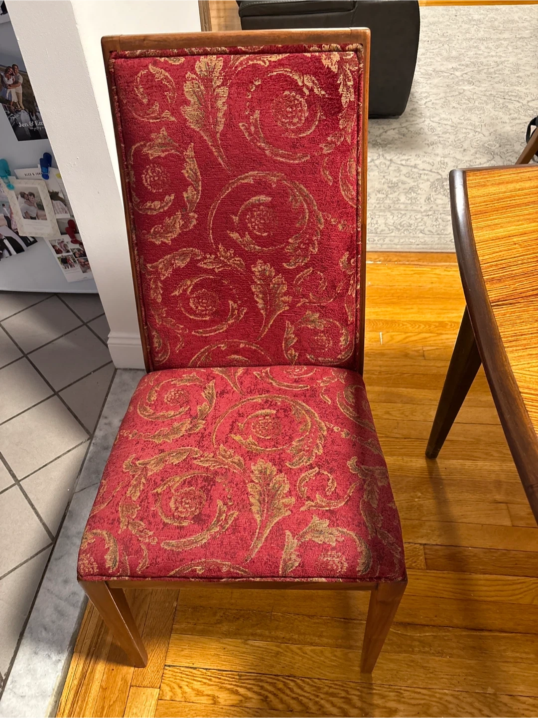 A nice wooden dining table with a unique patterned top and four matching chairs upholstered in a red, gold, and black brocade fabric. Has a built-in leaf to expand the table to seat six (81” long with the extra leaf). This set is perfect for intimate dinners or casual family meals. Chairs feature solid wood frames and comfortable seating.