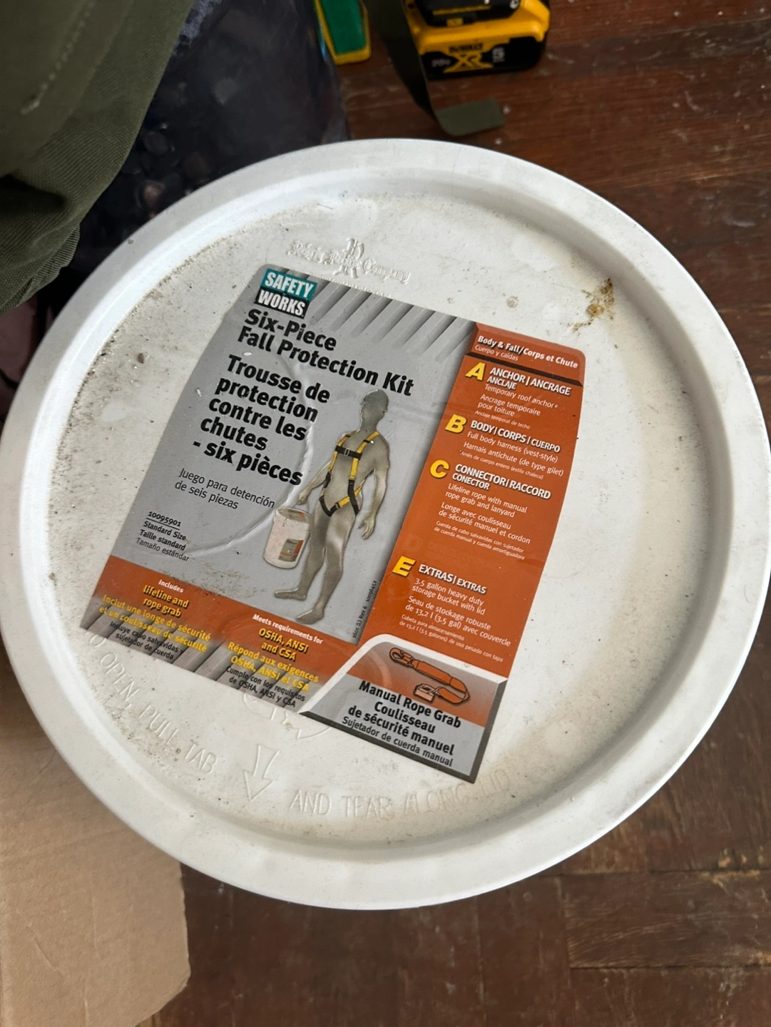 Six-piece fall protection kit. Includes full body harness, anchor, connector, rope grab, and lanyard. Comes in a heavy-duty bucket.