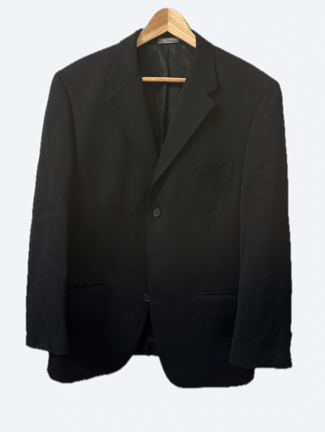 Classic black men's blazer. Three-button closure. Two front pockets. Long sleeves. Great for formal or business casual wear.
