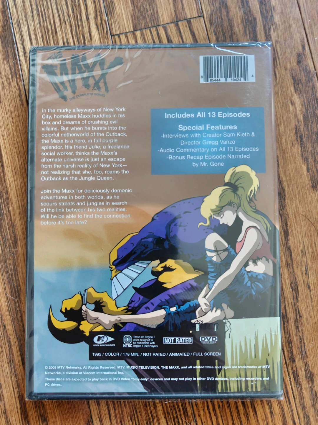 This DVD set includes all 13 episodes of The Maxx, "The Complete Series." MTV original. Special features include interviews and audio commentary. It's in excellent, factory-sealed condition.