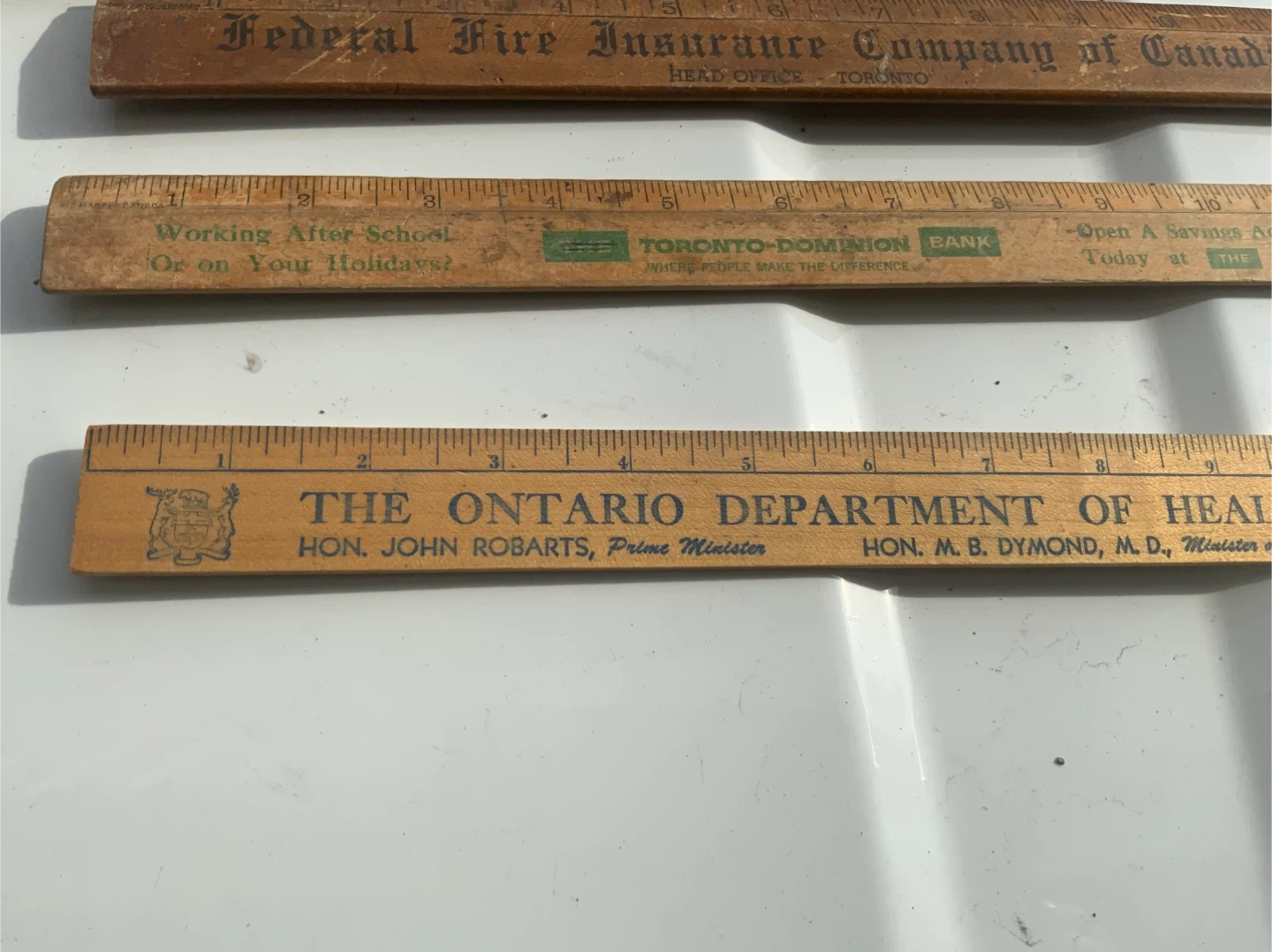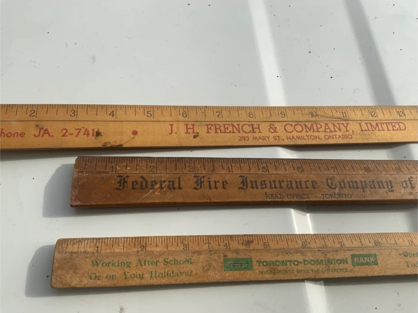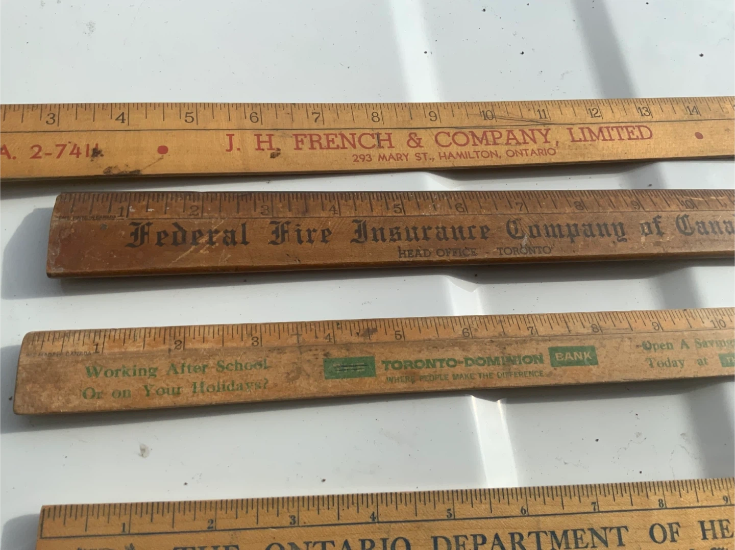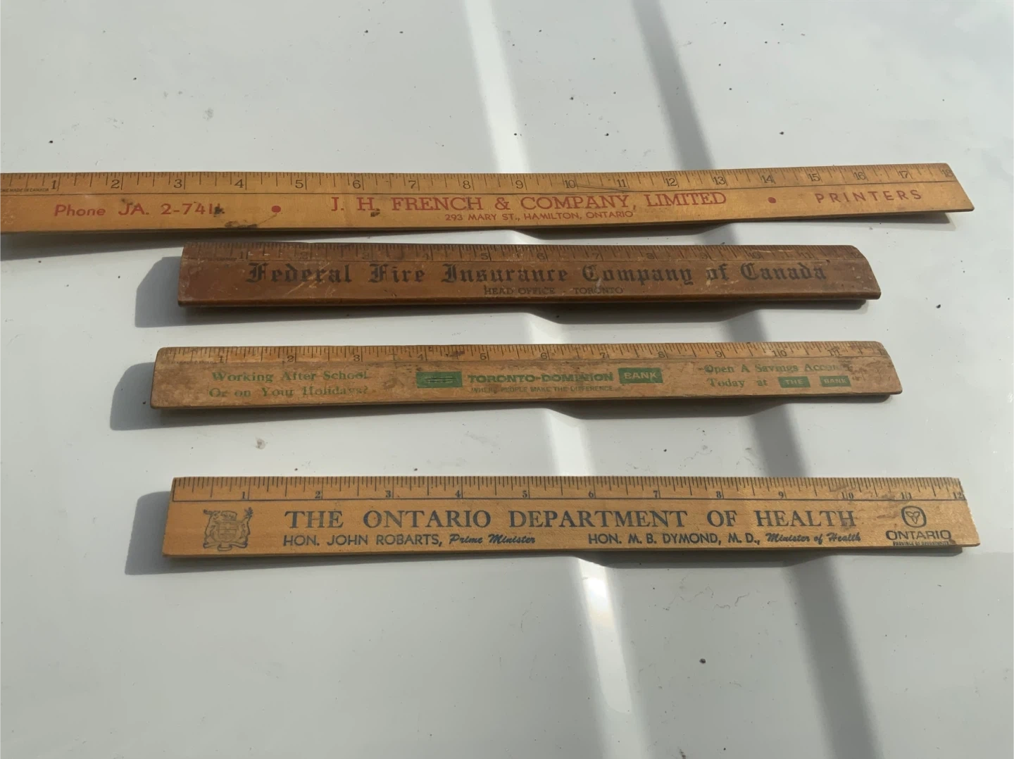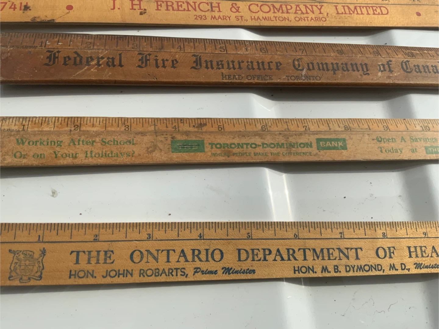 Four wooden rulers featuring vintage Canadian company logos. Includes J. H. French & Company Limited, Federal Fire Insurance Company of Canada, Toronto-Dominion Bank, and The Ontario Department of Health. These are standard 12-inch rulers with imperial markings. They're great for collectors or for practical use.