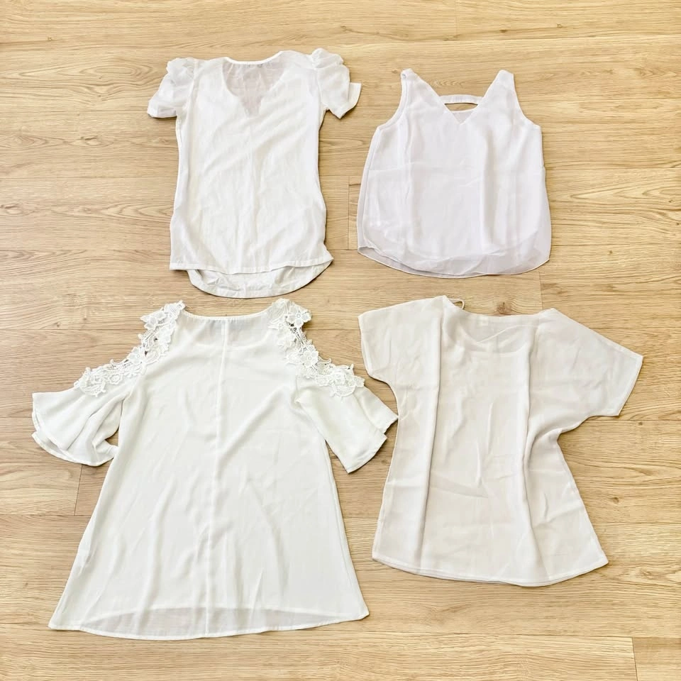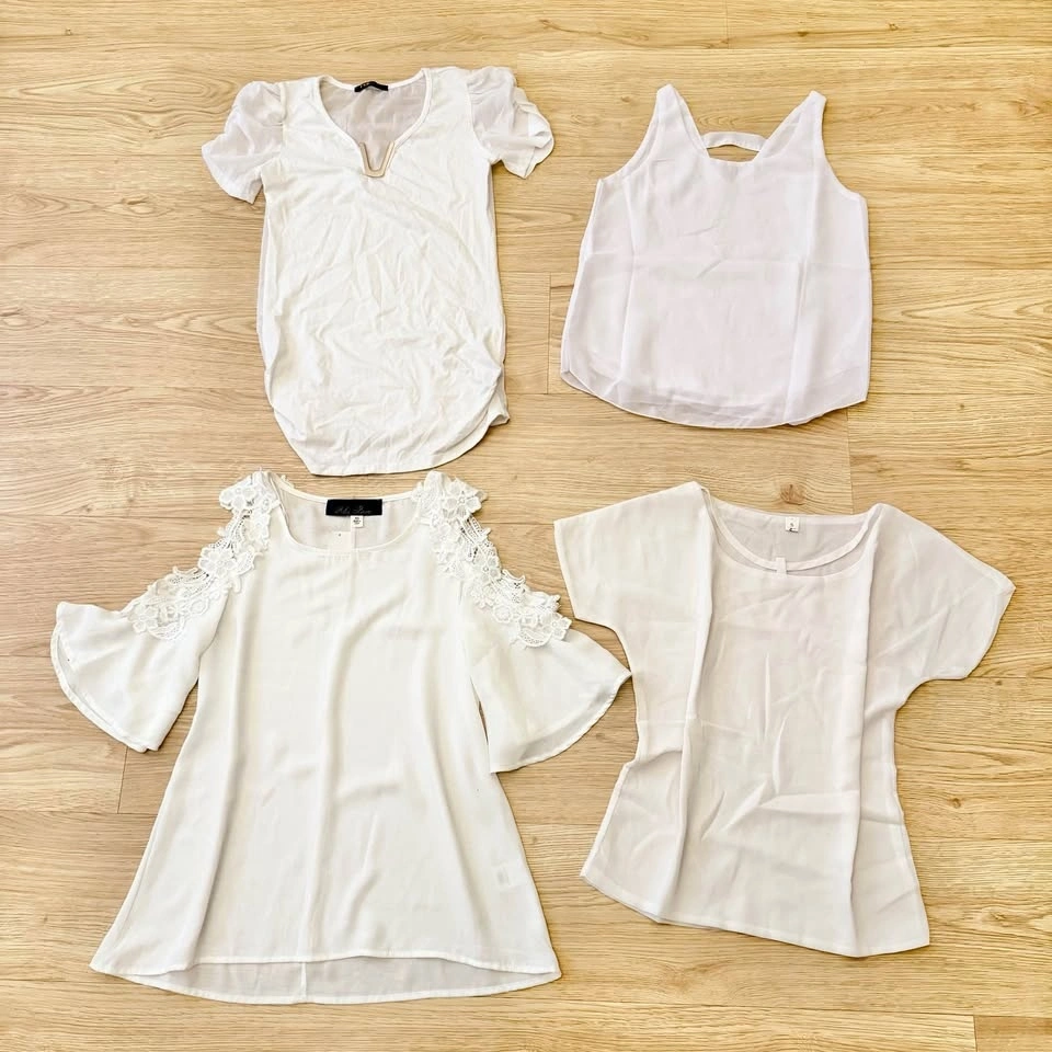 Some tags might say S, but everything in this bundle fits US Size XS. 3 tops are new without tags, and 1 is new with tags but a reinforcement strap got dyed. Please see the last photo for details.