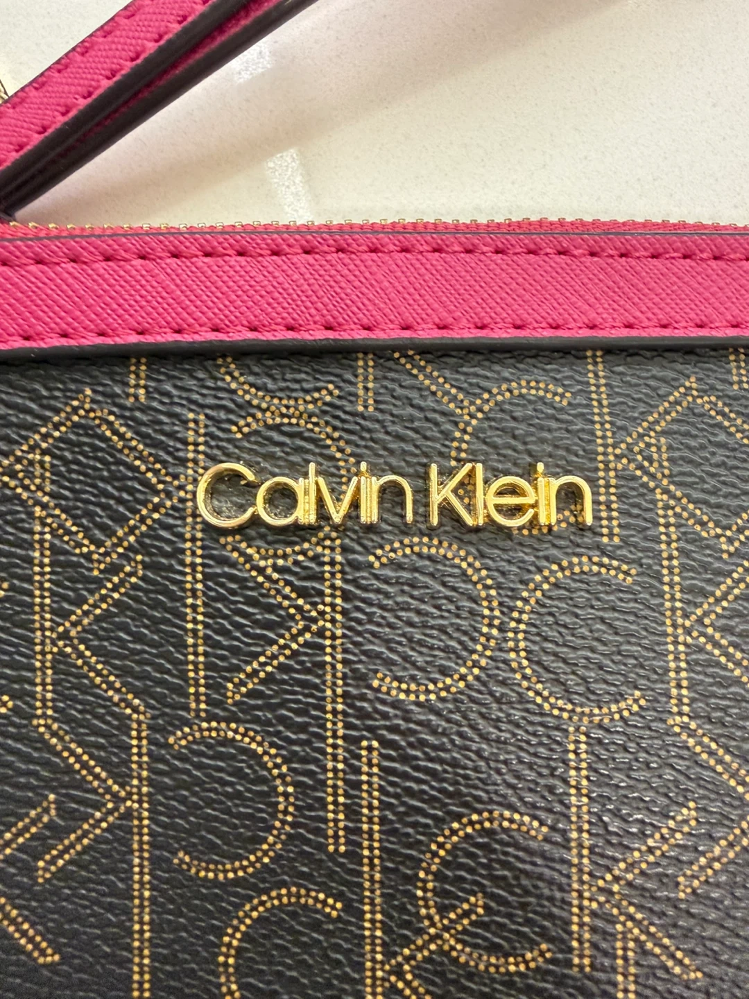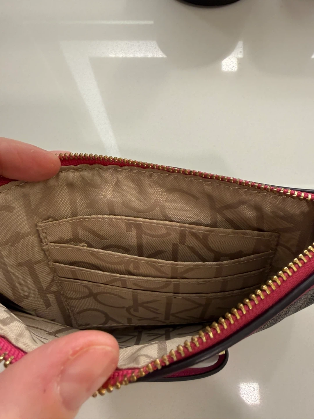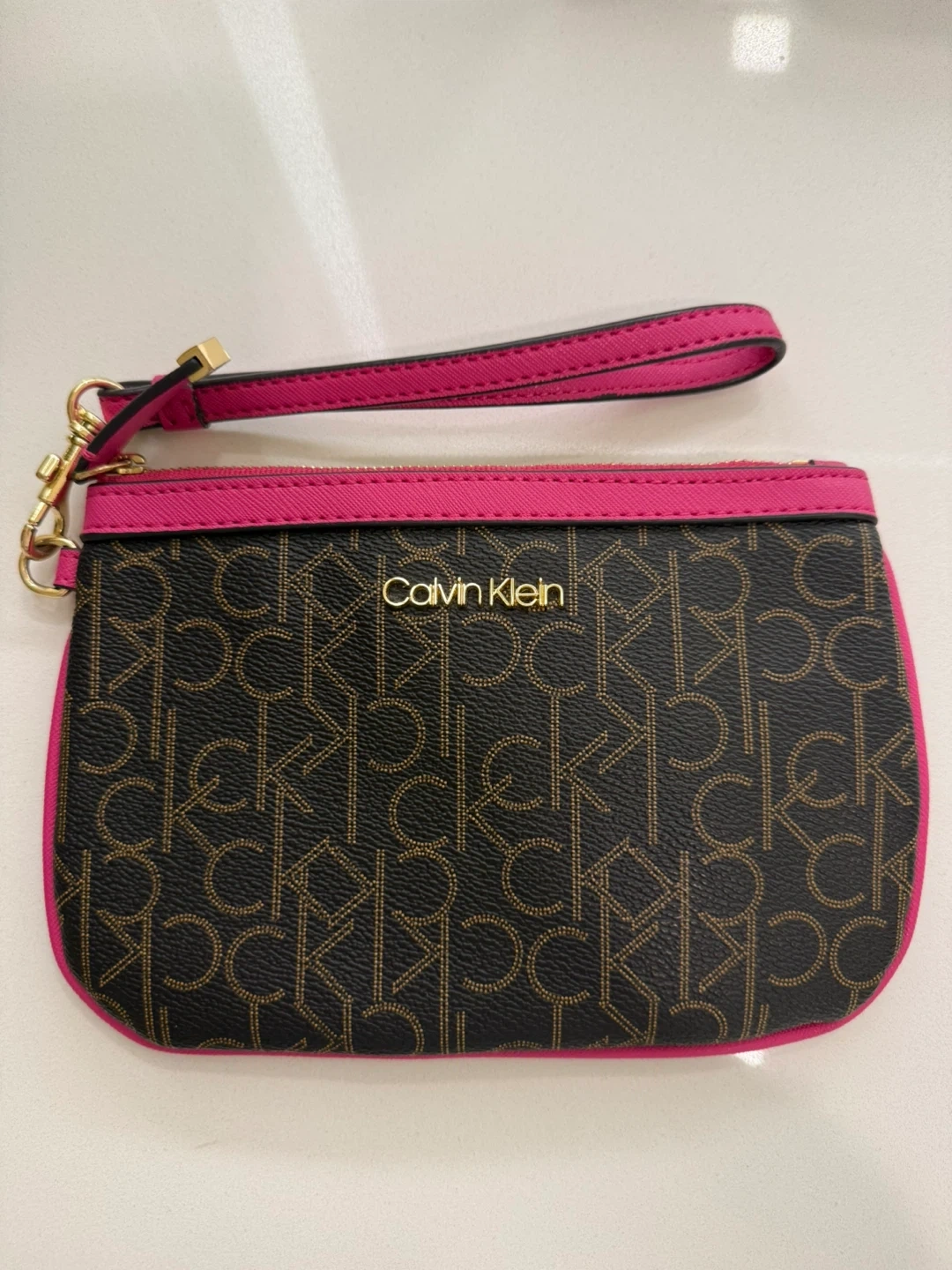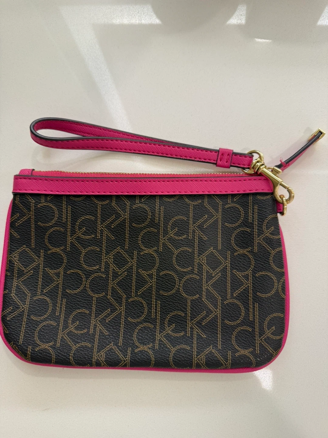 Calvin Klein wristlet pouch. Features a zip closure and interior card slots. Canvas exterior with hot pink trim.