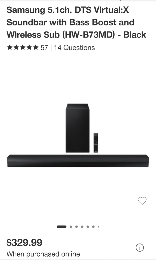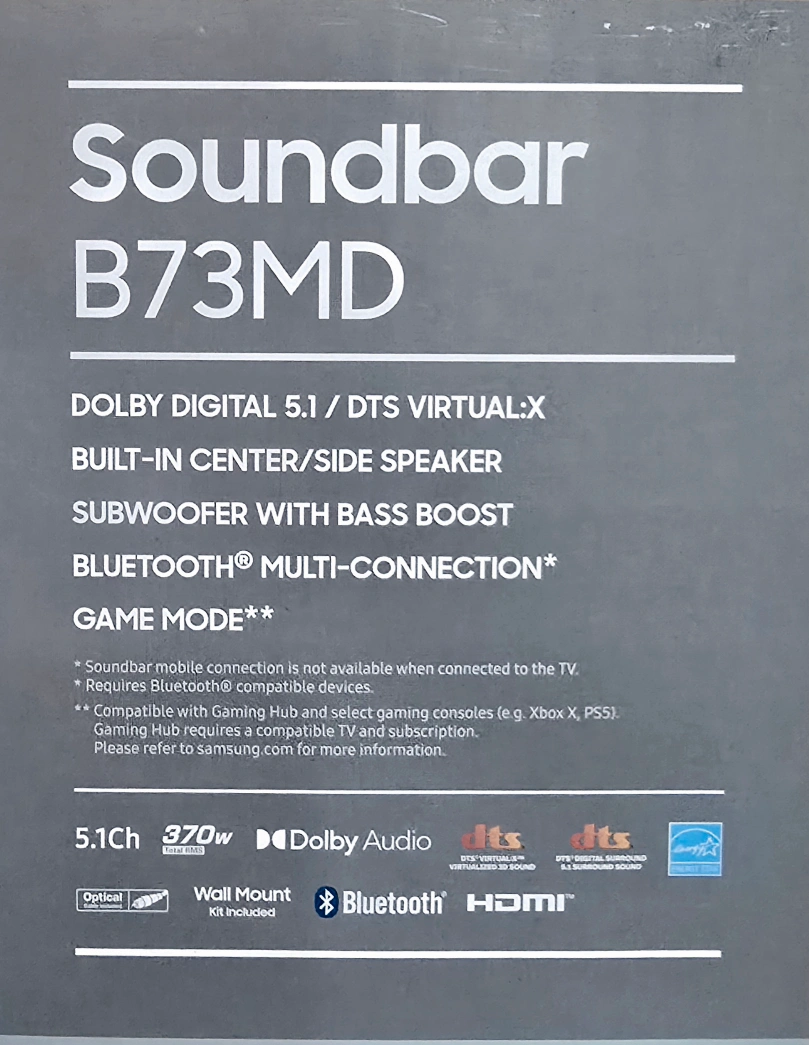 Samsung Soundbar B73MD with multi-directional sound. It's a 5.1 channel, 370w system.