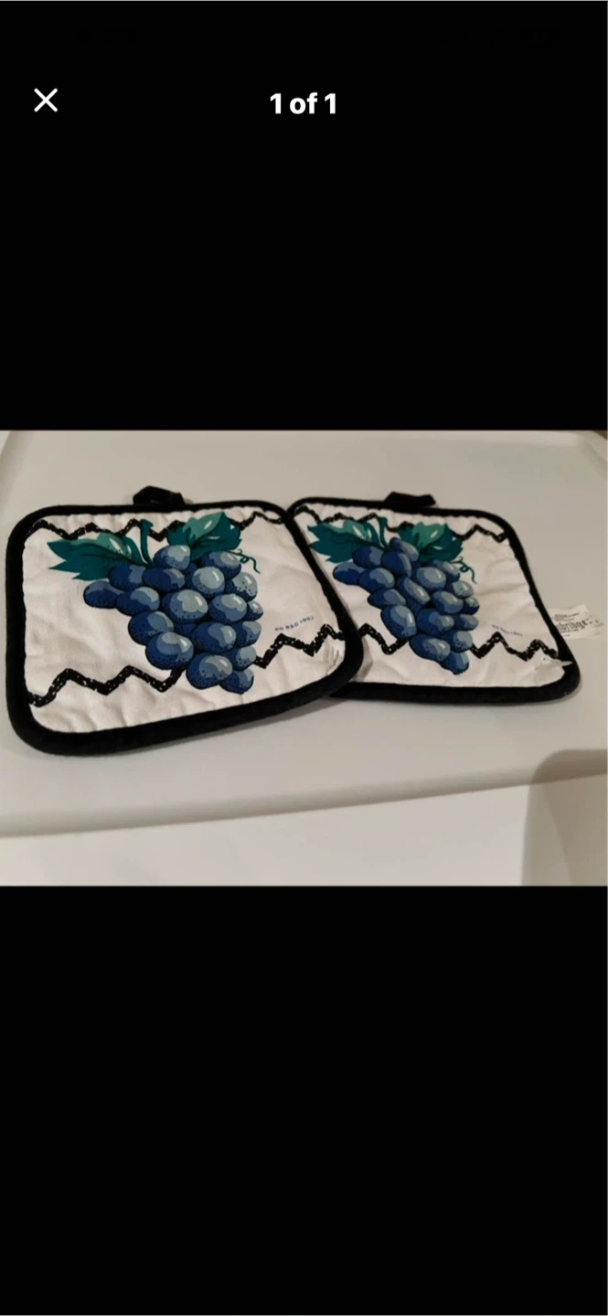 These pot holders feature a decorative grape design. They're great for protecting your hands from hot dishes. The quilted material provides insulation.