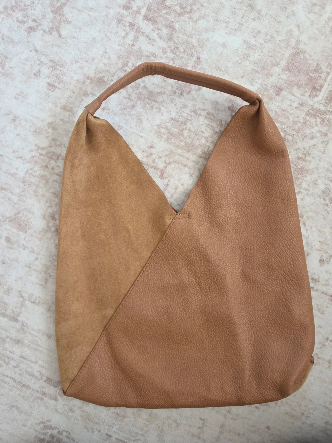 Stylish hobo bag in a tan color. It's made with a combination of faux leather and suede material. Features an exterior zip pocket with a branded zipper pull.