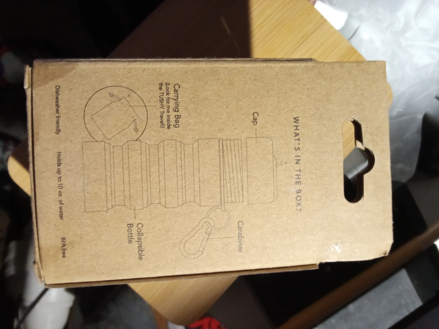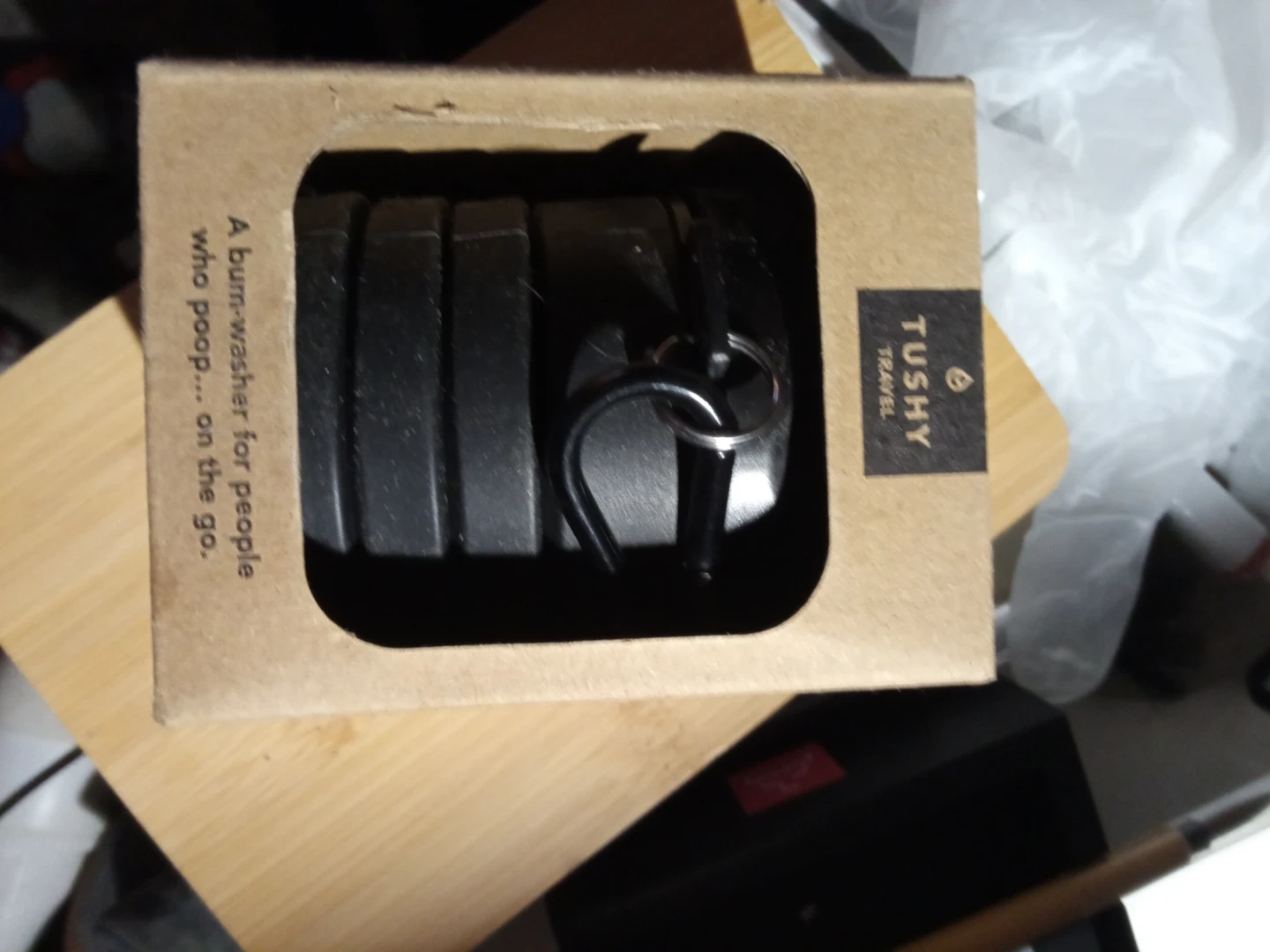 This is a TUSHY TRAVEL collapsible bidet bottle. It's BPA-free and holds up to 10 oz of water. It's dishwasher friendly and includes a carrying bag and carabiner for portability. Great for keeping your butt clean and healthy on the go!