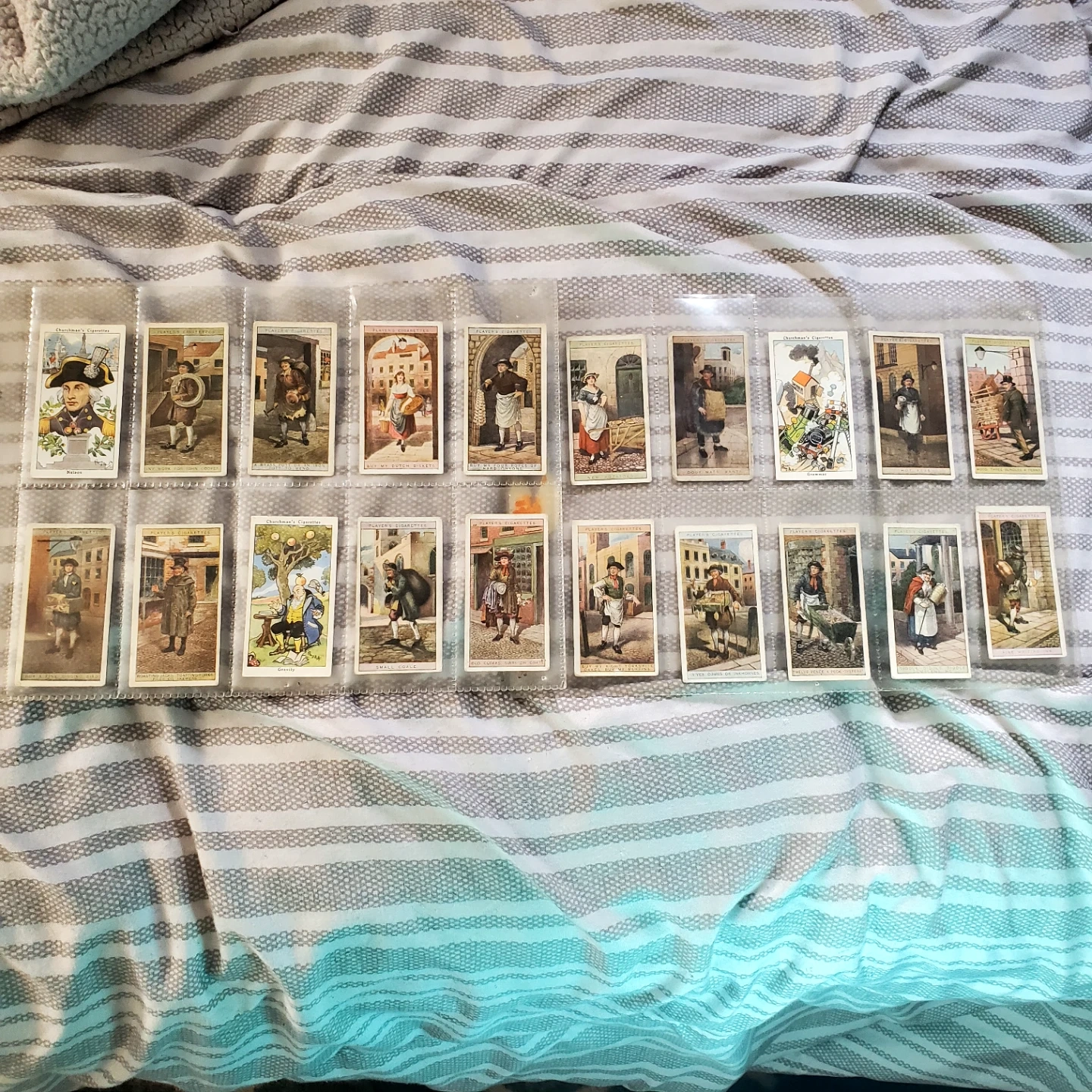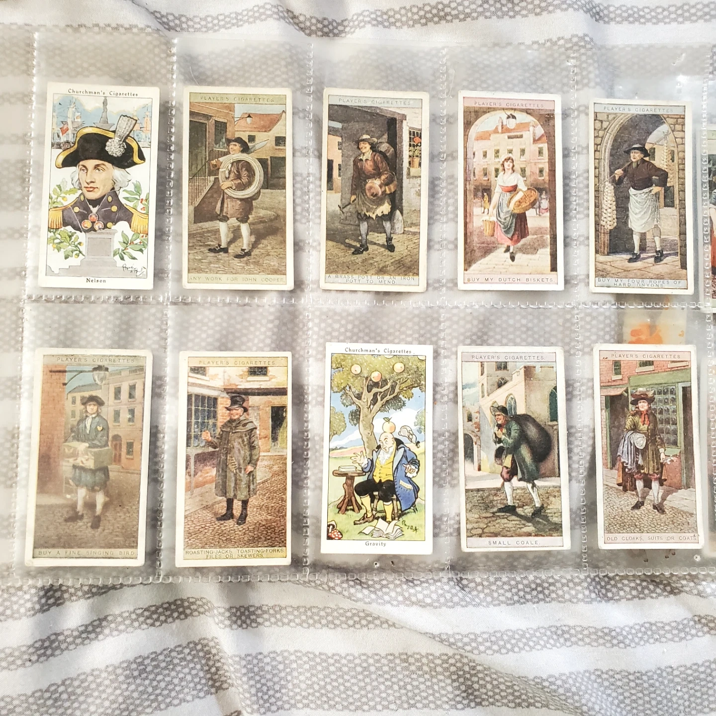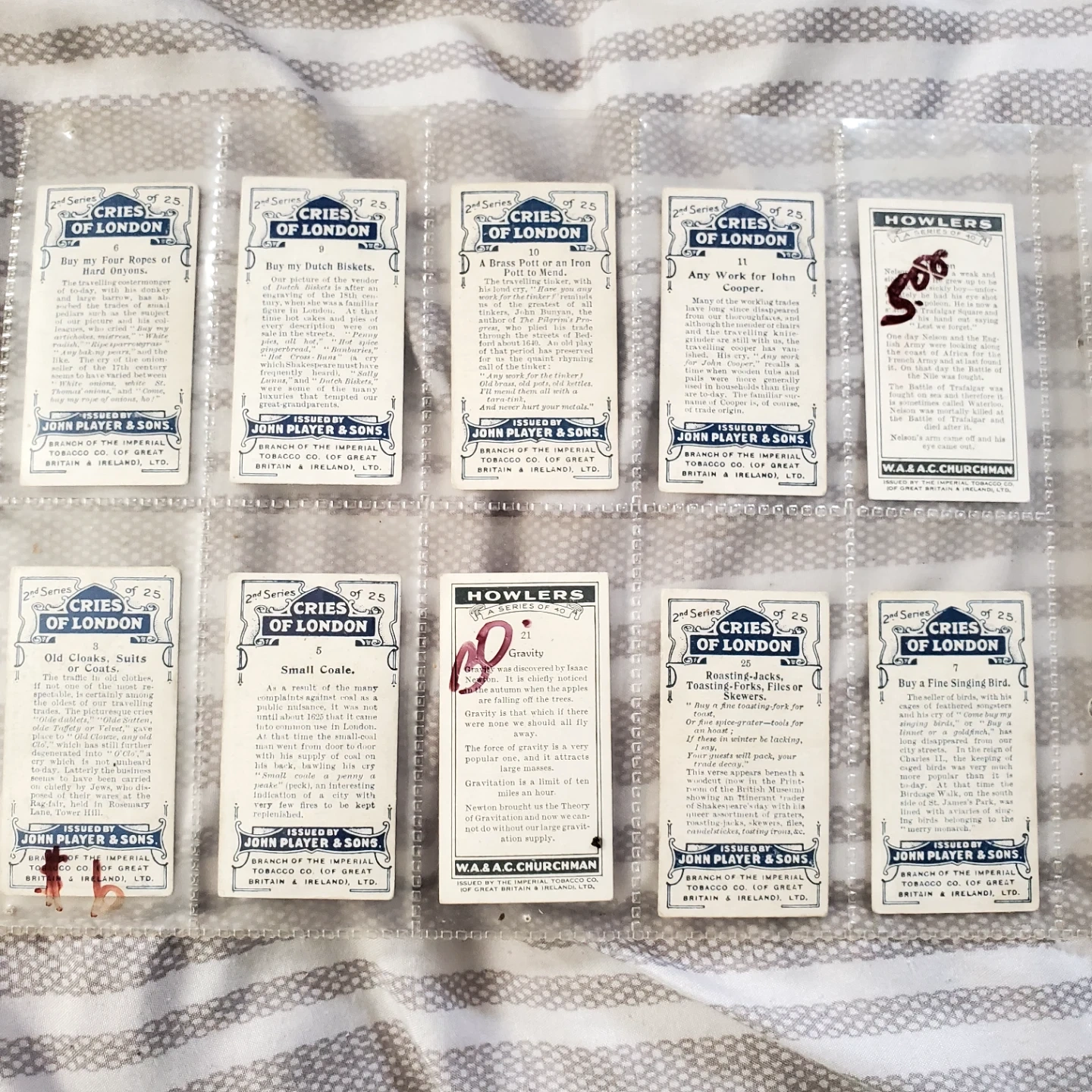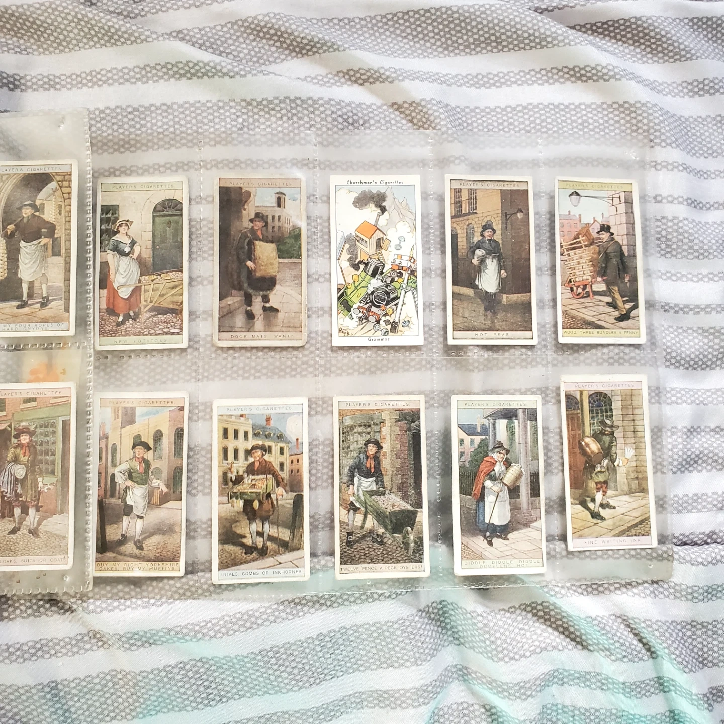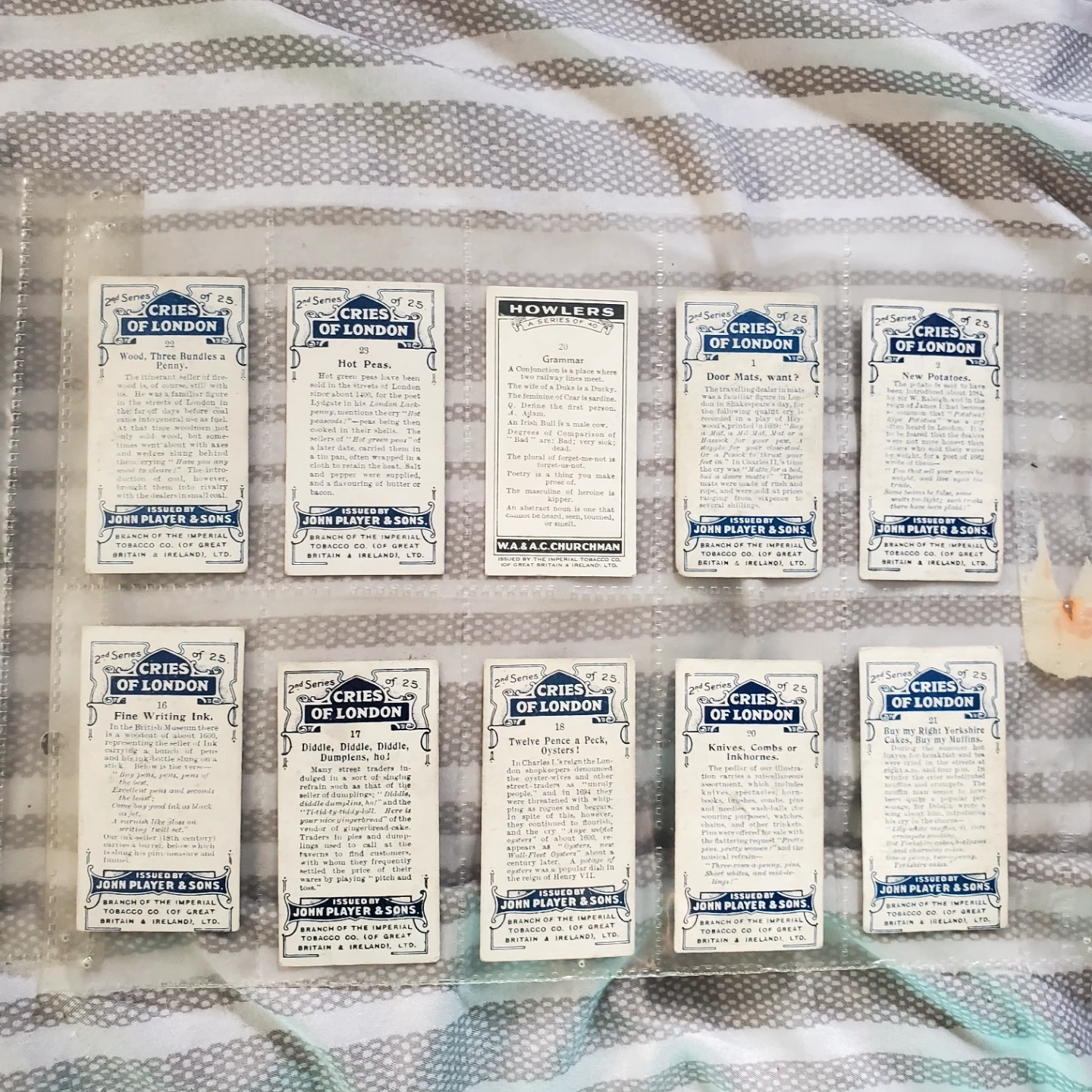 Collection of Cries of London 2nd Series cigarette cards from John Player & Sons. Each card depicts a street vendor or character from London. Cards include various historical scenes and descriptions. There are 20 cards aprox 2x1in all in good plus shape, always been in envelope. Price is for all pls.
