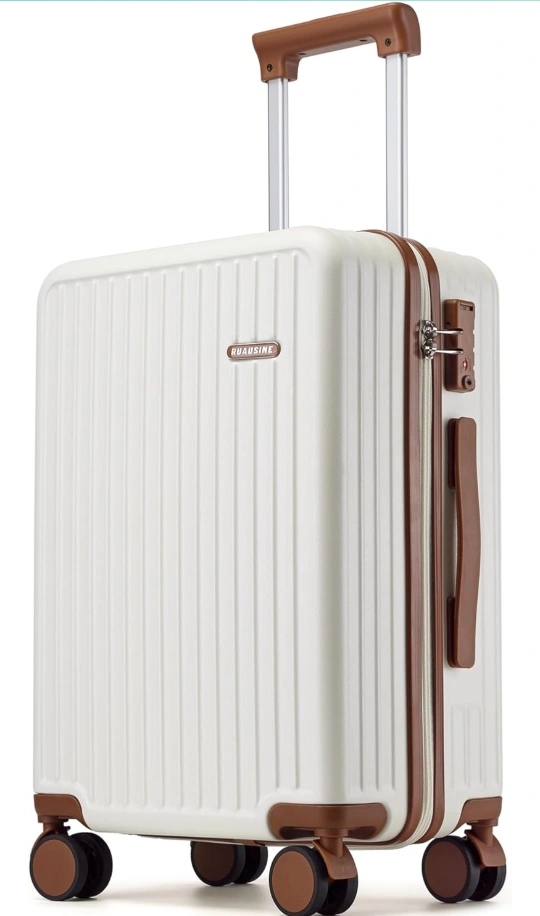 Selling a RUAUSINE carry-on suitcase in white. It features a brown handle and accents, and has a combination lock. Perfect for your next trip!