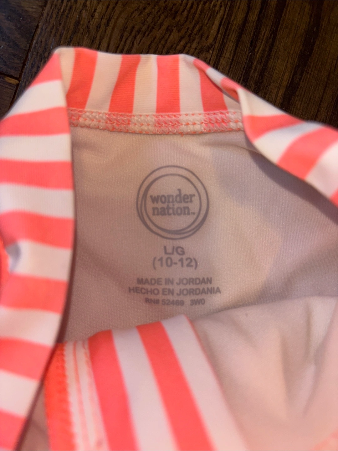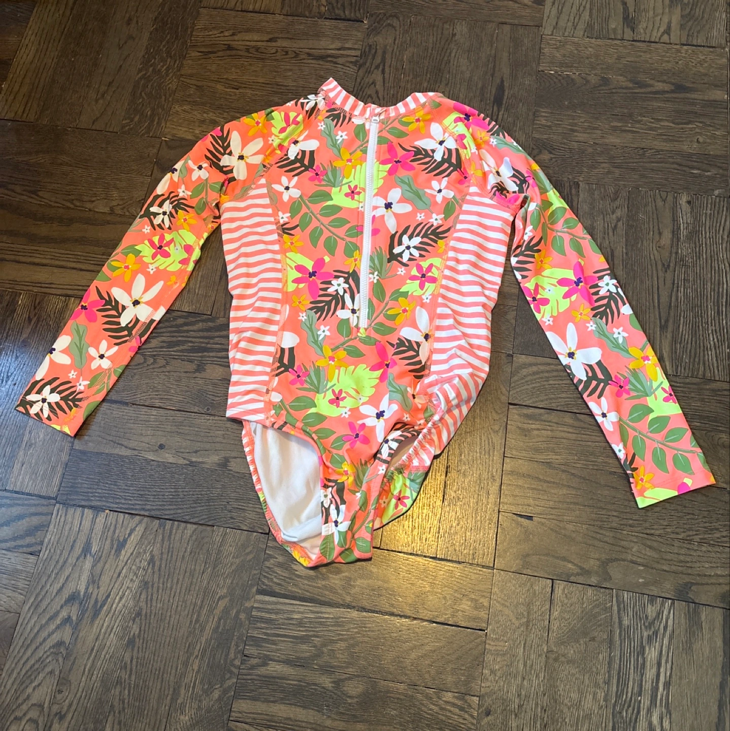 Girls' coral and white striped rashguard swimsuit. Floral print. Long sleeves. Zip front. Size Large (10-12 YO)