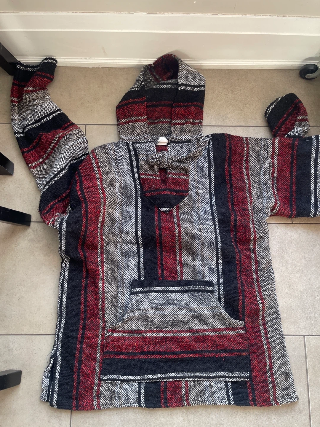 This is an Outdoor Tribe Baja hoodie pullover. It's a size L/G and features a red, black, and white striped pattern. Made from 100% reclaimed fibres. Great for a casual, laid-back look!