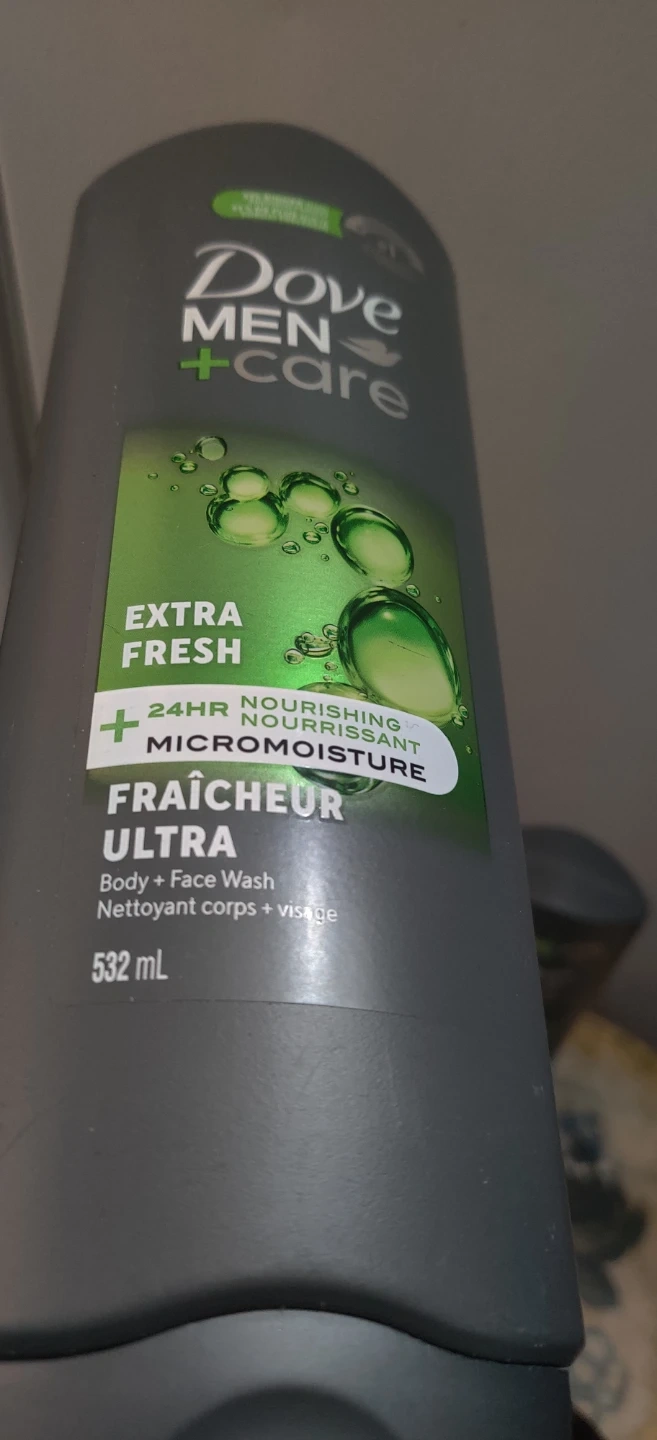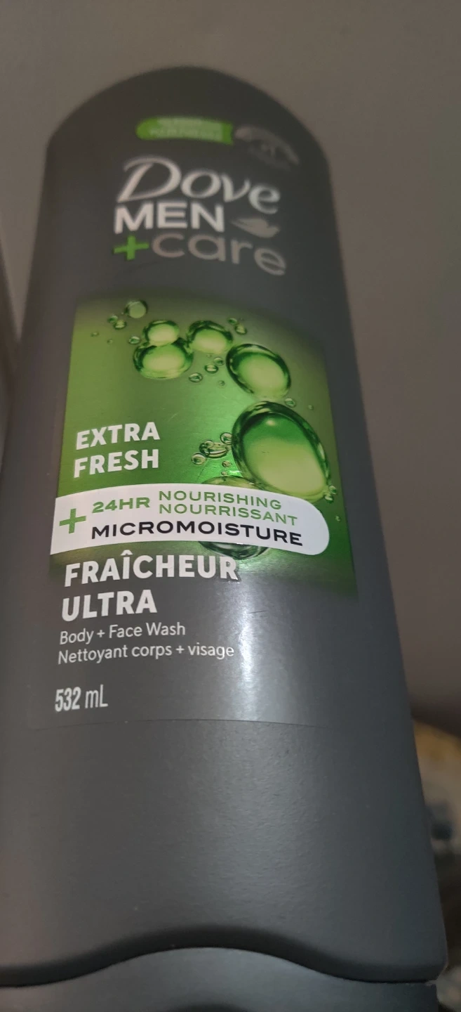 2 Dove Men+Care Extra Fresh Body + Face Wash. Features 24HR nourishing Micromoisture. 532 mL bottle.