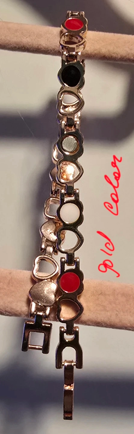 This rose gold tone bracelet features a link design with alternating heart shapes and circular inlays. Some inlays are red, and others are black. It's a magnetic bracelet with a clasp closure. Includes a small magnetic piece on the back.