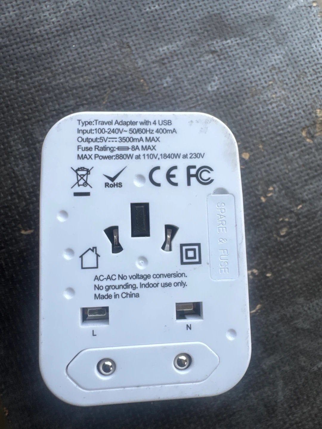 This travel adapter supports EU, UK, USA/AUS outlets and includes 4 USB ports. It's rated for 100-240V input and 3500mA output. A spare fuse is included. This adapter is great for international travel!