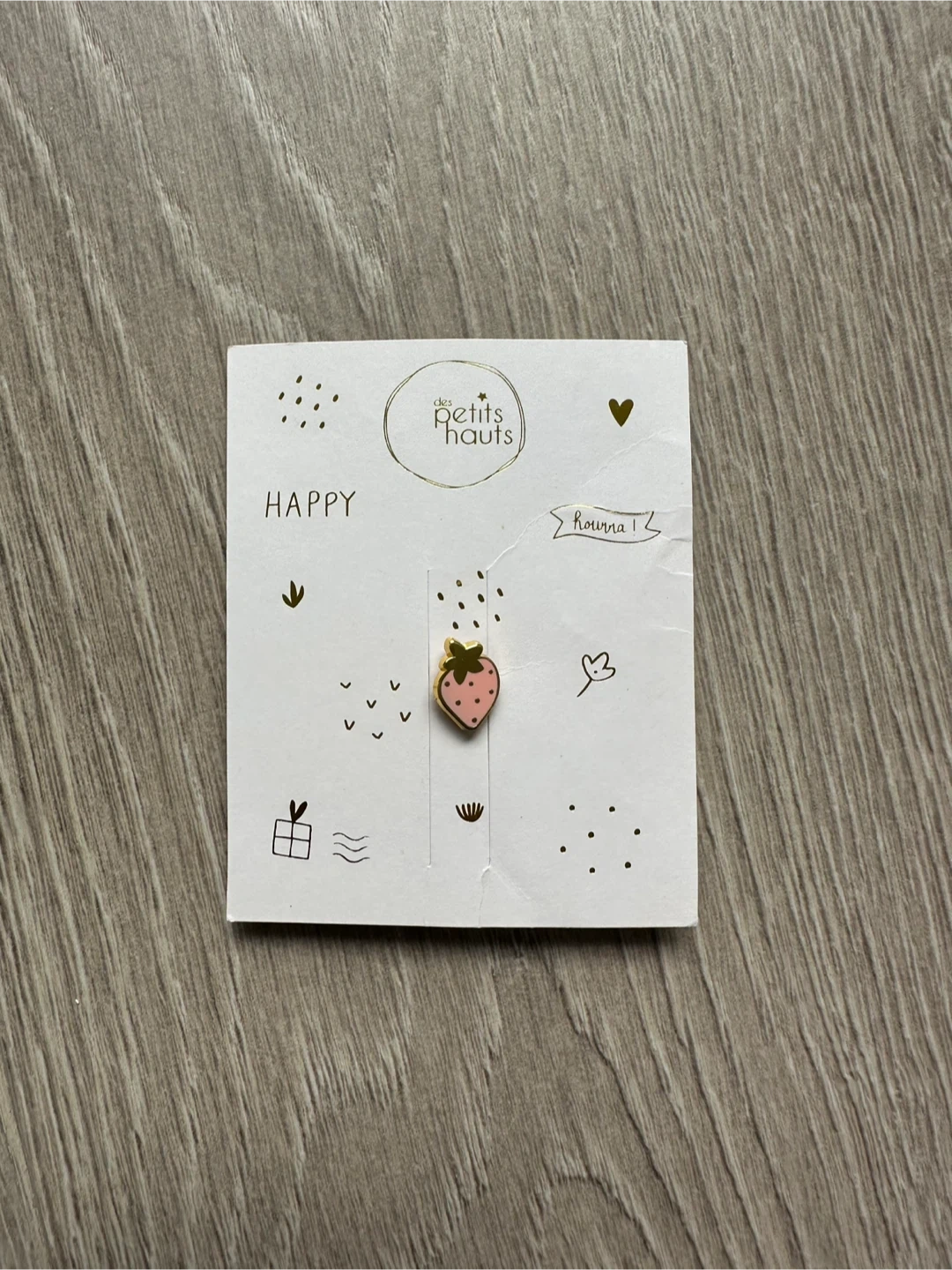 Cute strawberry enamel pin from Des Petits Hauts. It's a fun little accessory for your bag or jacket. Metal pin with pink enamel strawberry design.