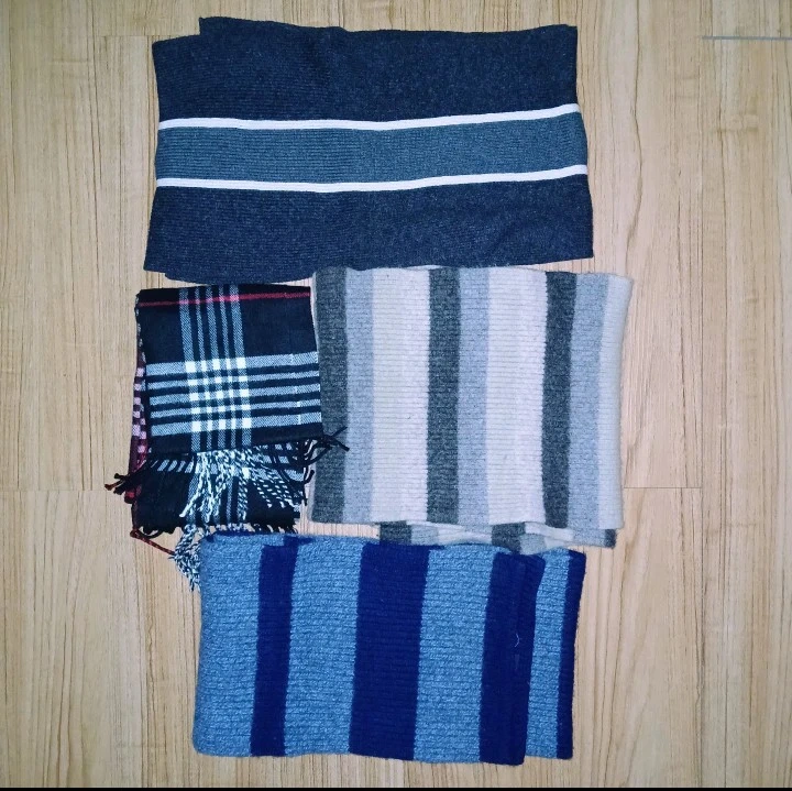 This set includes four knitted scarves. One features horizontal stripes in navy, gray, and white. Another has a black and red plaid pattern with fringe. A third scarf displays vertical stripes in light gray and beige. The final scarf is blue with dark blue vertical stripes.