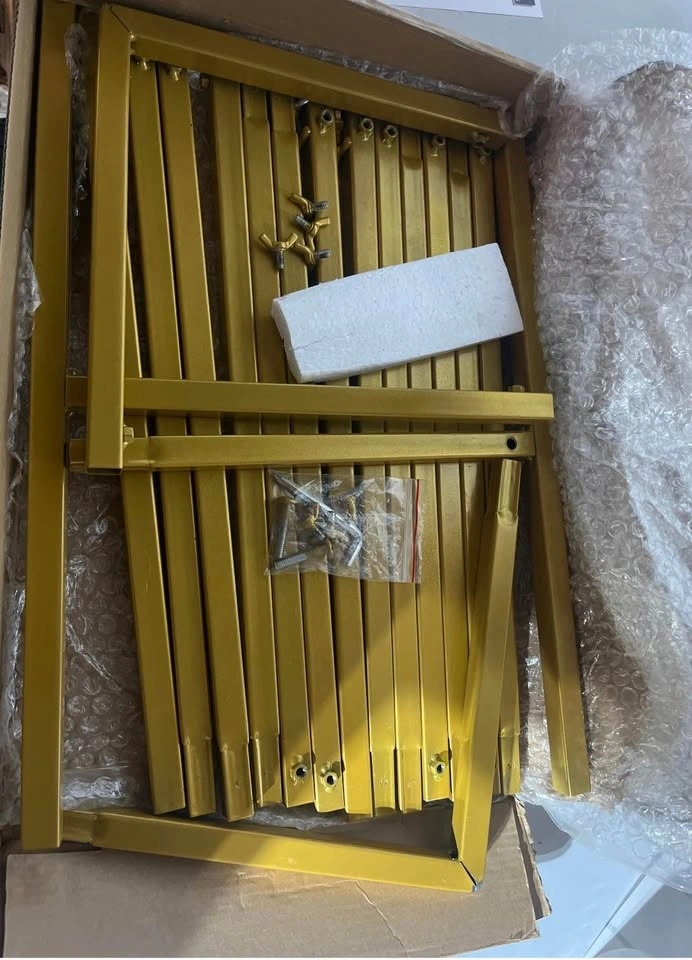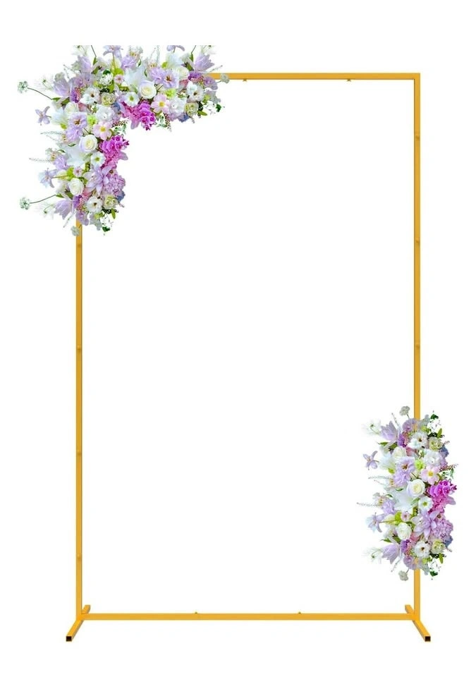 Brand new. This gold metal arch backdrop stand has a classy square shape and solid metallic construction, giving you a robust base for celebrations. It's perfect for decorating with flowers, greenery, garlands, LED lights, tulle, silk flowers, or vines to create breathtaking backdrops for your special day. It can be used both indoors and outdoors. The size is 6.6ft x 4ft (Height x Width). The square pipes and sturdy formation create outstanding wedding arches, door arches, or balloon/floral arches. It features solid feet for firm and balanced support, and the heavy-duty metallic construction makes it safe, secure, and sturdy. This versatile arch is great for weddings, birthday parties, baby showers, anniversaries, and graduations. You can use your creativity to decorate it with flowers, plants, vines, balloons, or LED lights. It's built with an additional crossbar to reinforce stability, making it pretty strong and tough for holding elements. The arch is stable on its own as long as the wing nuts and screws are secured tightly. It's also perfect for holding backdrops or banners, setting up photo booths, and for home or professional studio use. Let me know if you're interested!