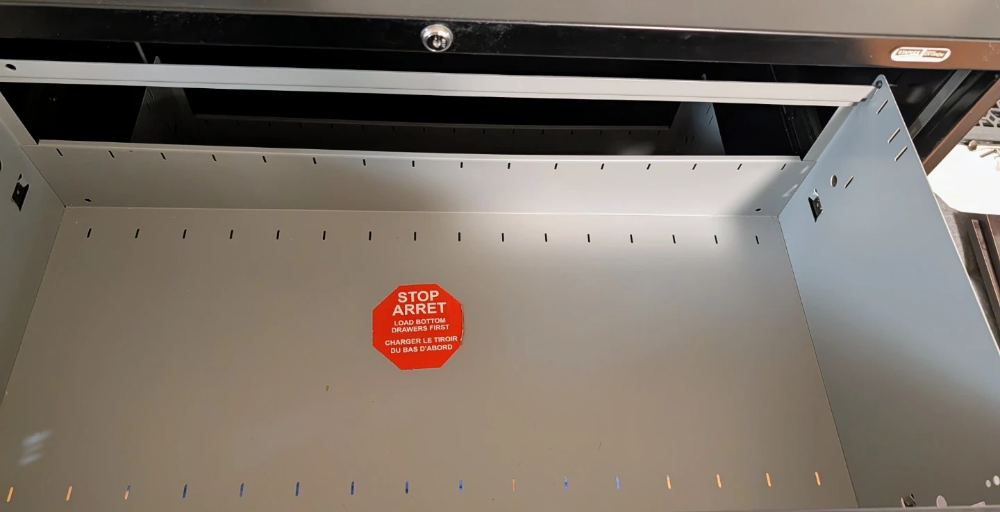This is a black 3-drawer filing cabinet. It's made of metal and has silver handles. The drawers have sliding mechanisms for easy access. Keep your important documents organized with this sturdy cabinet!