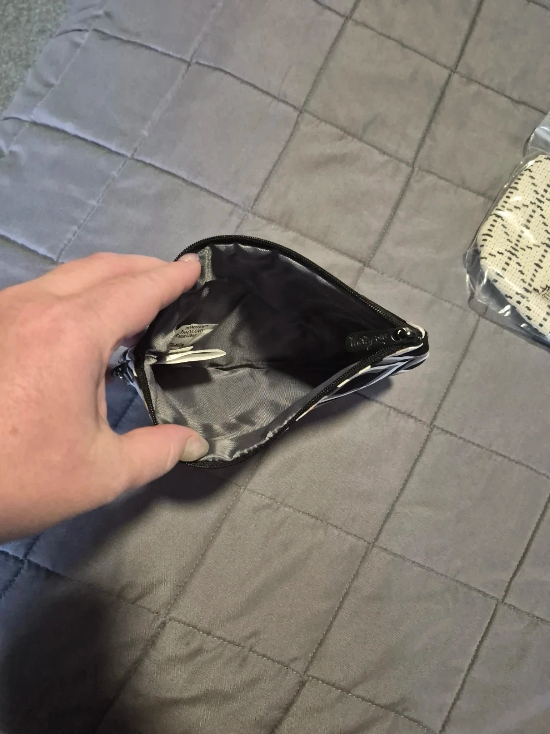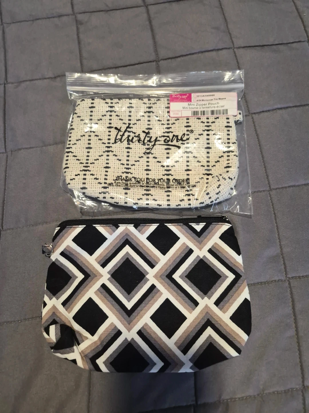 Set of two Thirty-One zipper pouches. One features a black and white geometric tile weave pattern and comes in original packaging. The other has a black, grey, and beige diamond pattern. They're great for organizing small items!