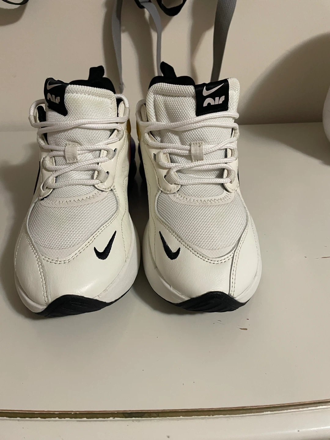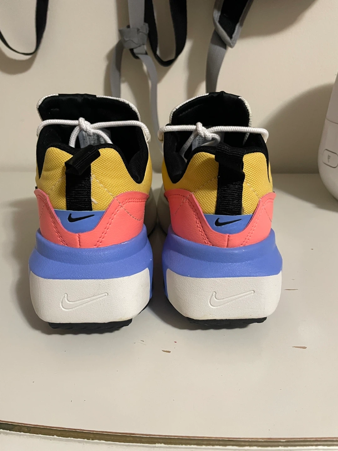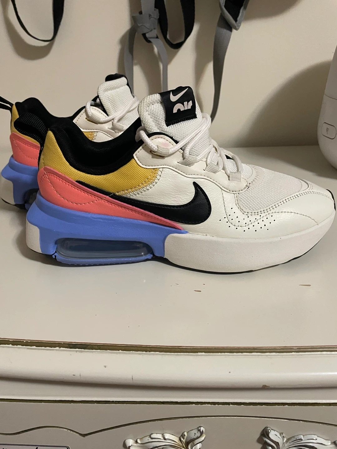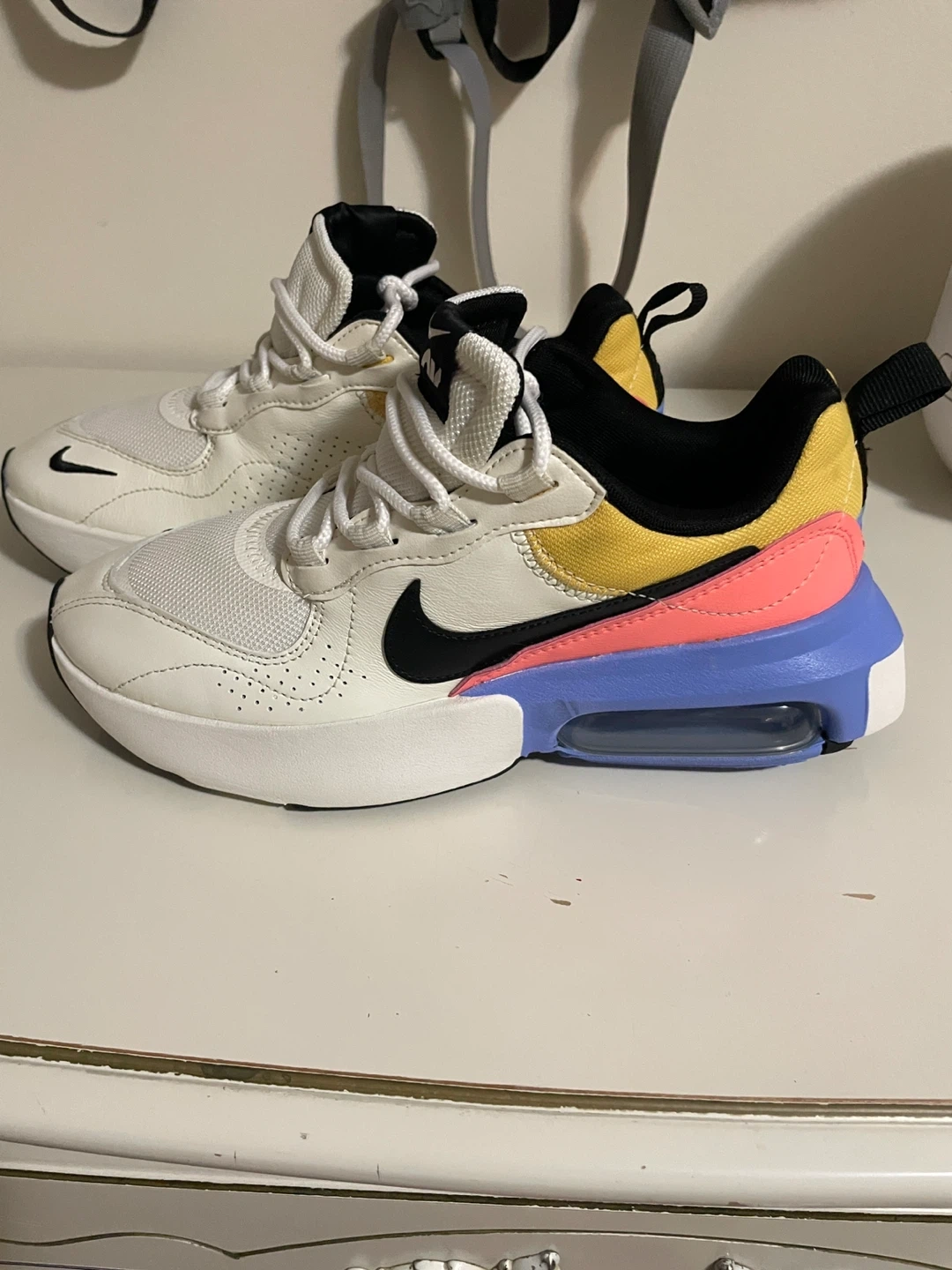 Selling a pair of Nike Air Max Bliss women's sneakers! They're in great condition and feature a stylish design with a white base, black accents, and a colourful heel with yellow, pink, and blue. Perfect for adding a pop of colour to your workout or everyday look!