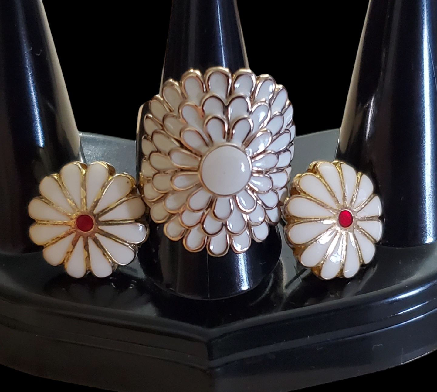 Set includes a ring and two earrings, all with a white enamel daisy design and gold trim.