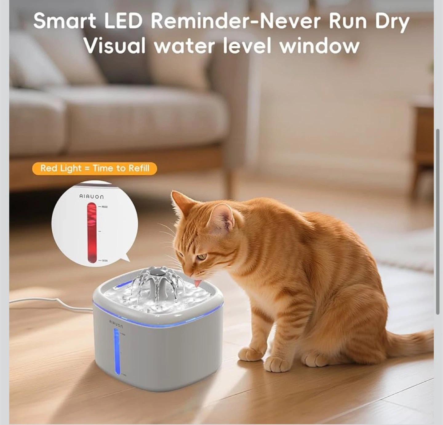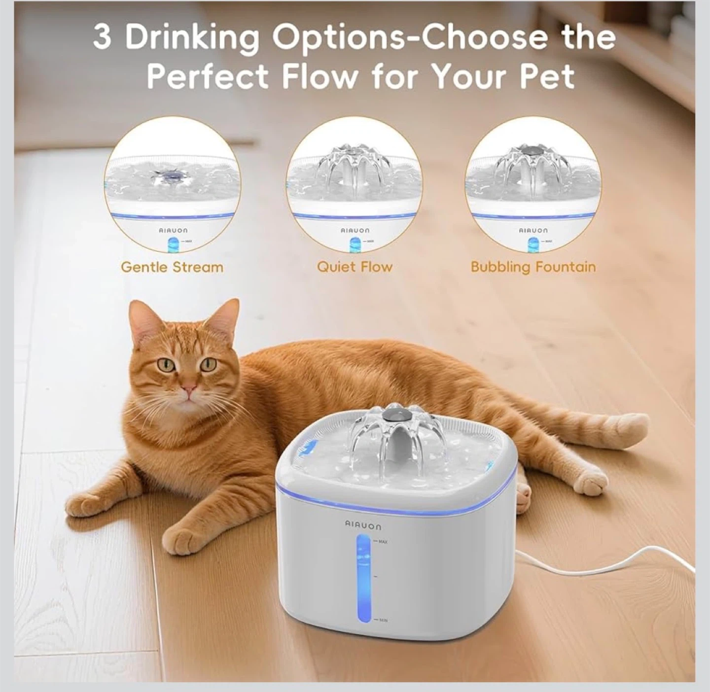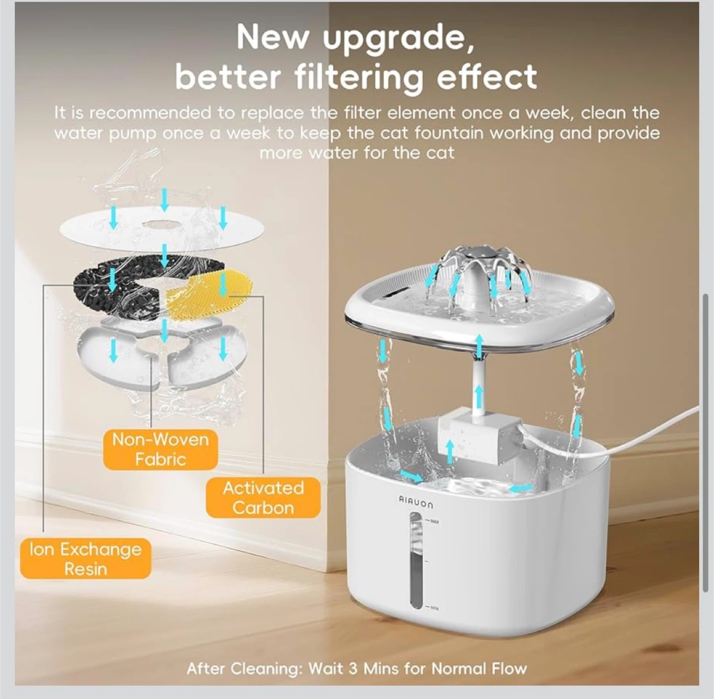 This AIAUON pet water fountain holds 2.5L and features a triple filtration system with non-woven fabric, activated carbon, and ion exchange resin. It offers 3 drinking flow options and has a visual water level window with an LED reminder. The fountain encourages pets to drink more water and lasts 4-7 days.
