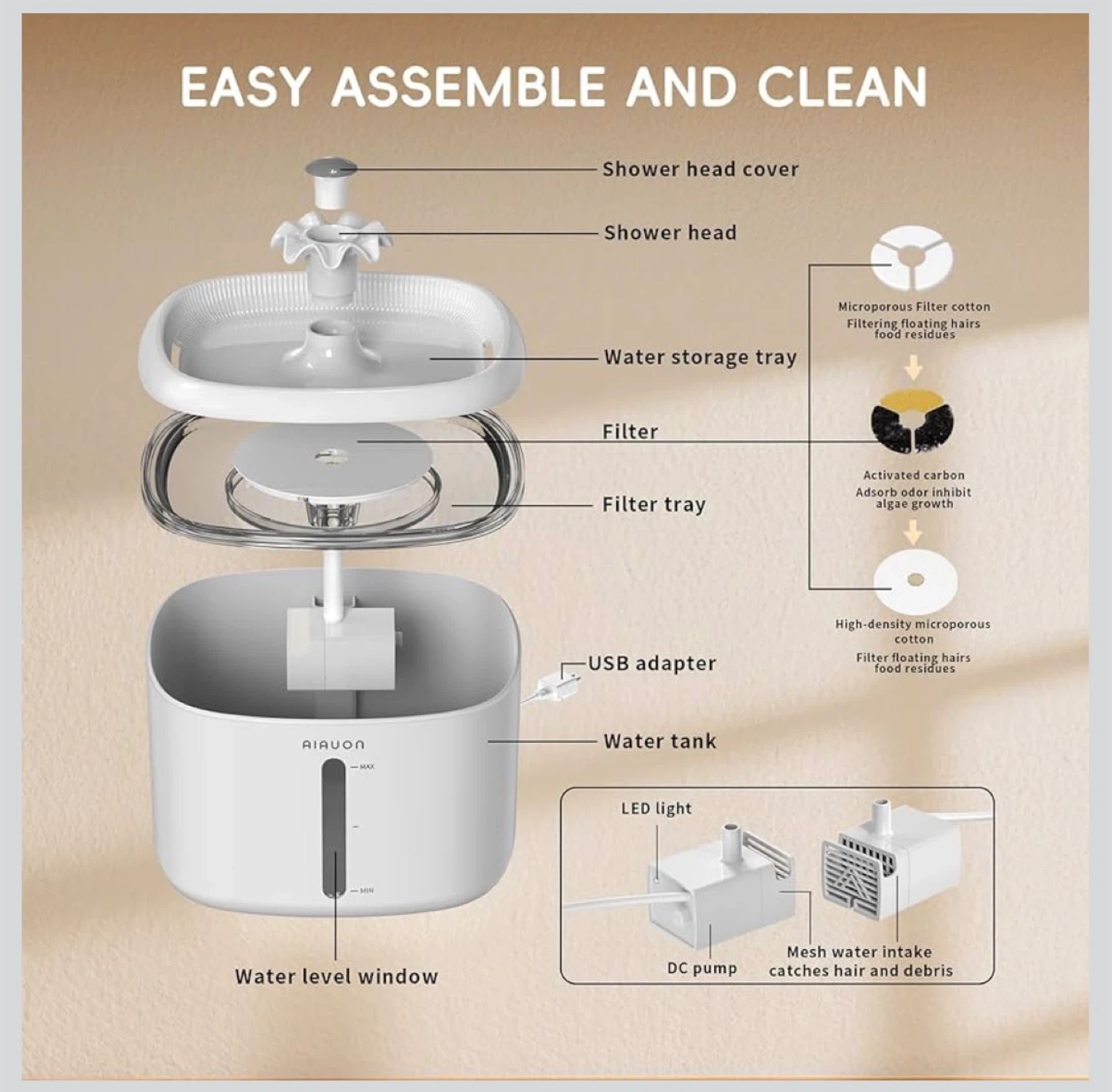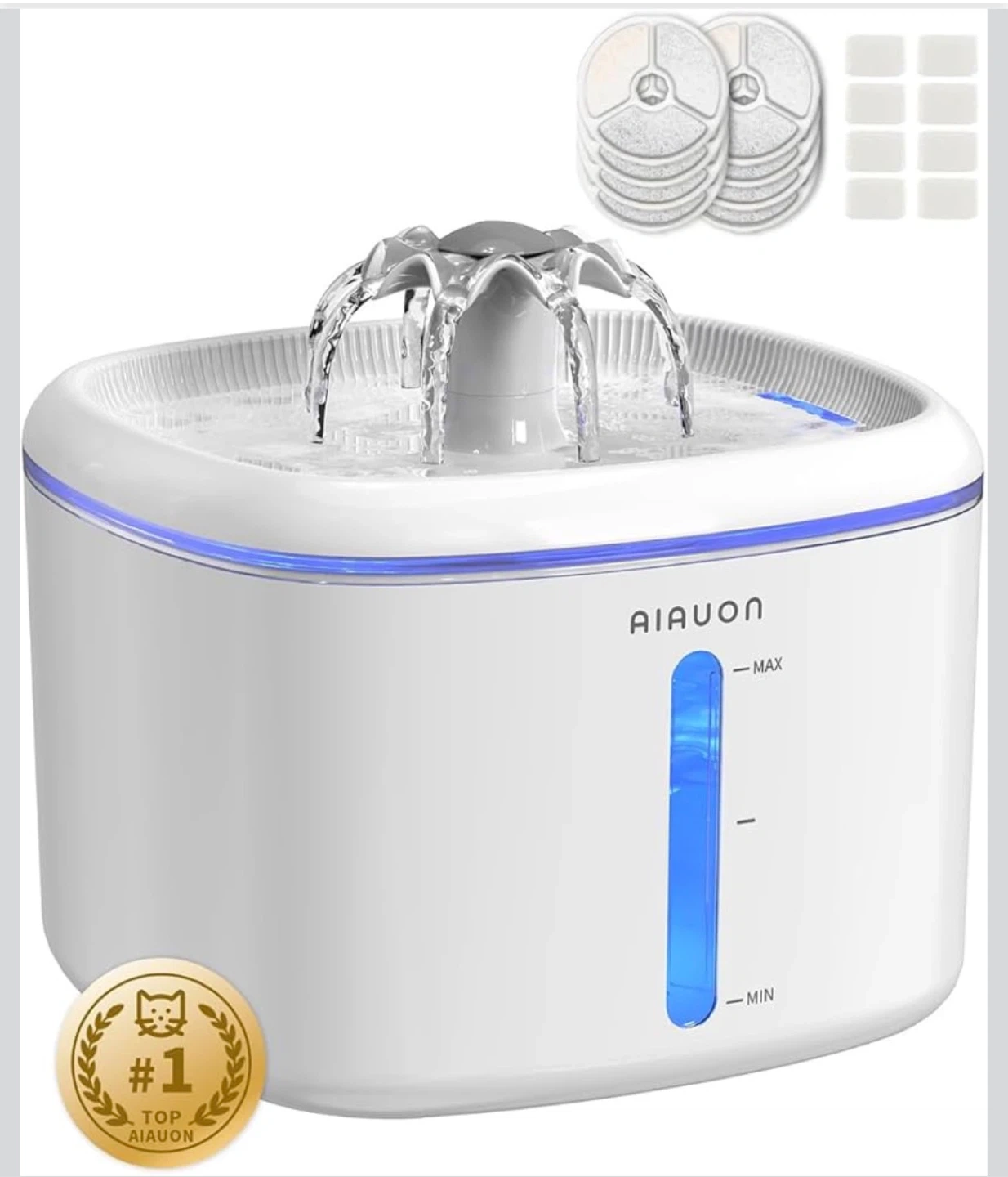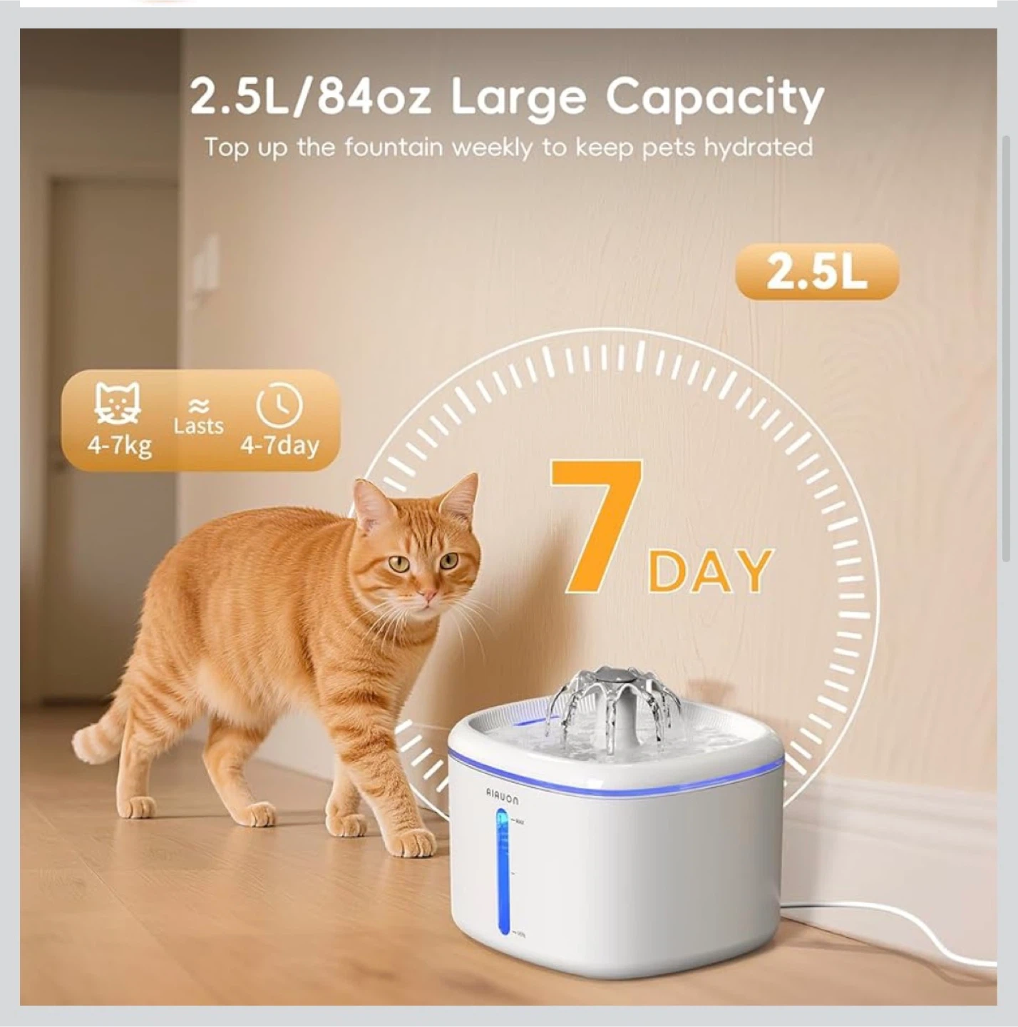 This AIAUON pet water fountain holds 2.5L and features a triple filtration system with non-woven fabric, activated carbon, and ion exchange resin. It offers 3 drinking flow options and has a visual water level window with an LED reminder. The fountain encourages pets to drink more water and lasts 4-7 days.