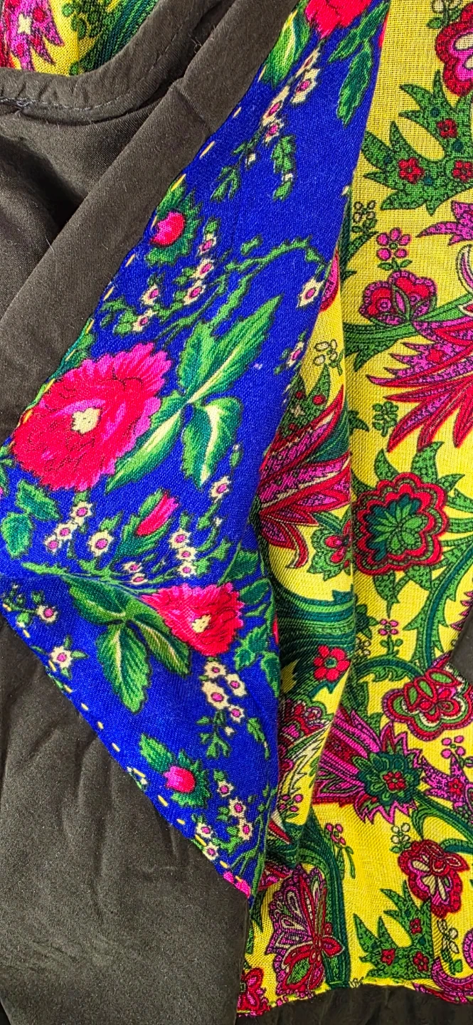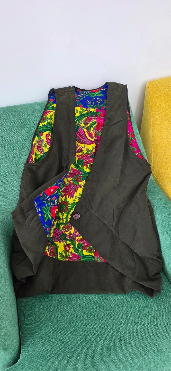 It's new and features a vibrant floral print lining with bold blues, yellows, and pinks. The lining is added to the vest by hand stitches.