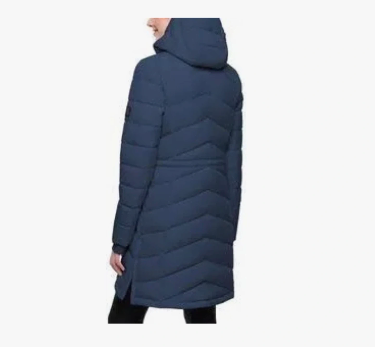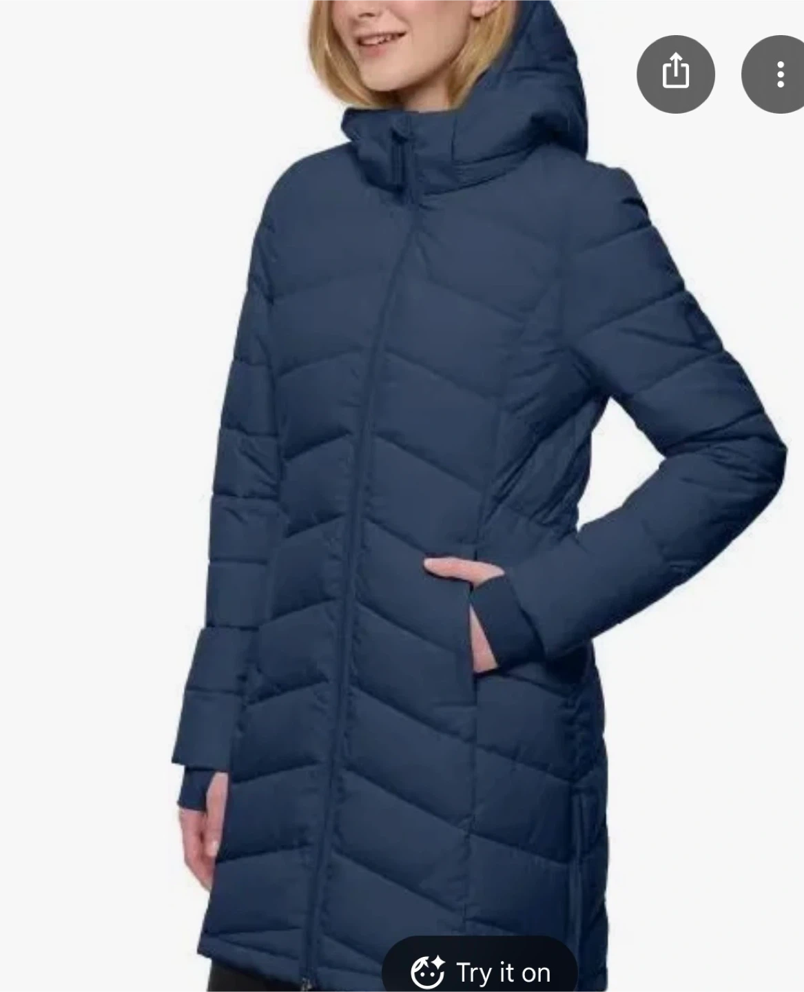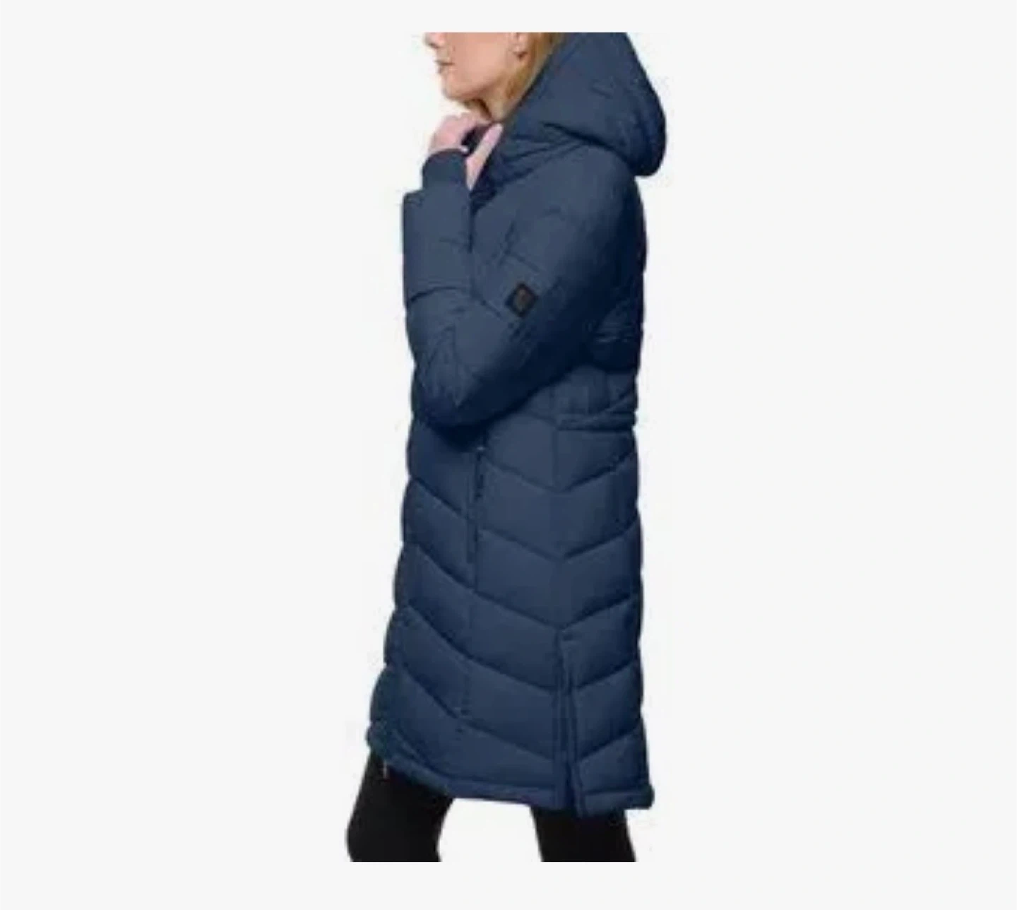 This is a warm, knee-length puffer coat. It features a zippered front closure and a hood for extra protection. Side pockets are included for convenience.