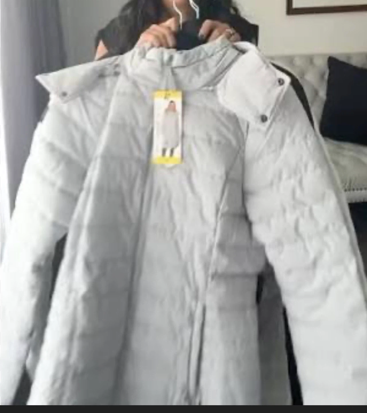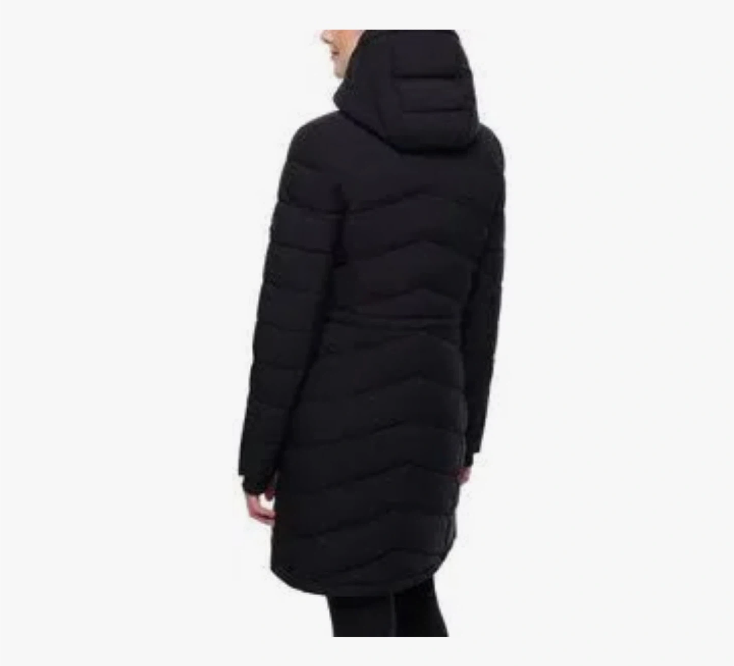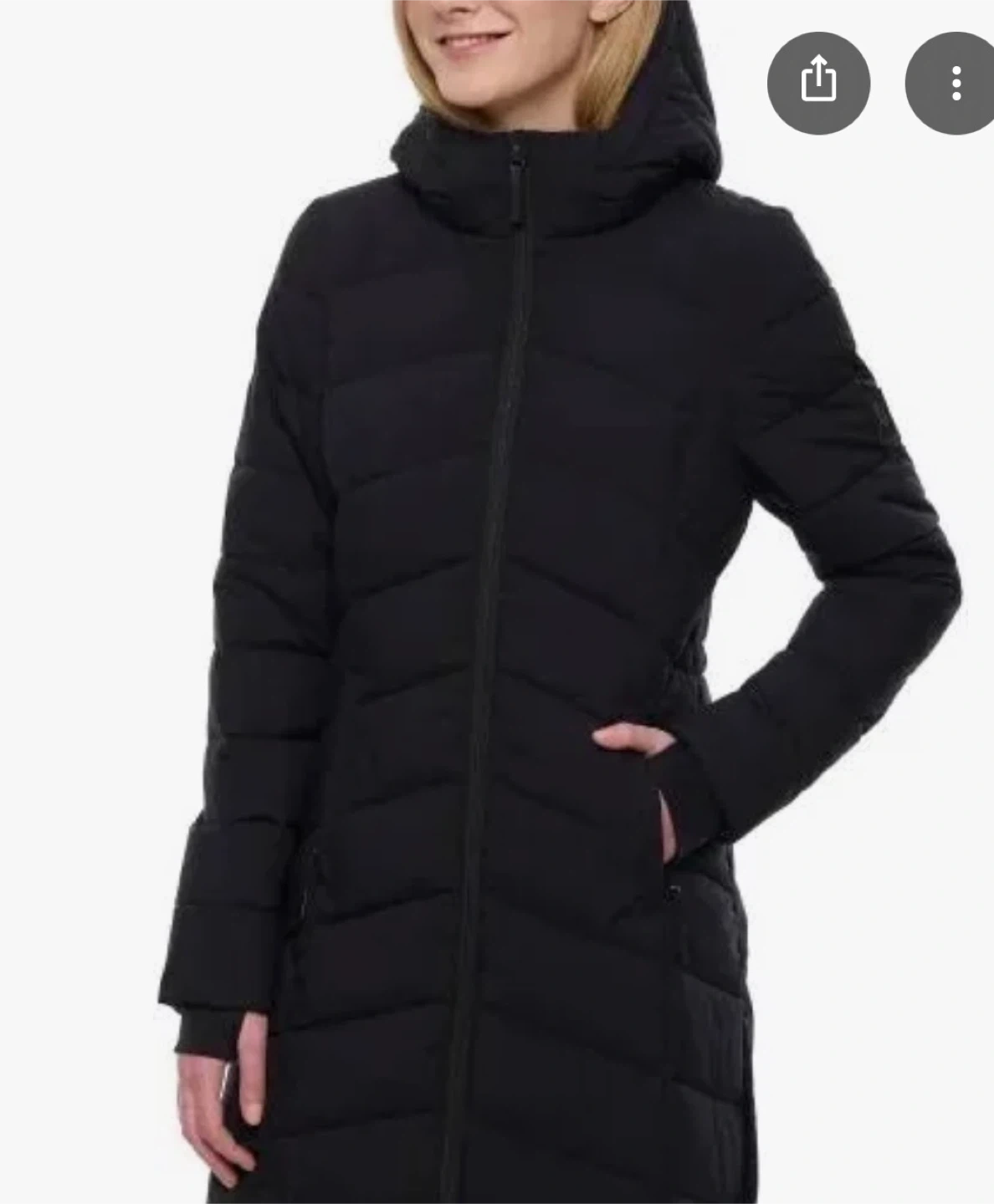 This is a warm, knee-length puffer coat. It features a zippered front closure and a hood for extra protection. Side pockets are included for convenience.