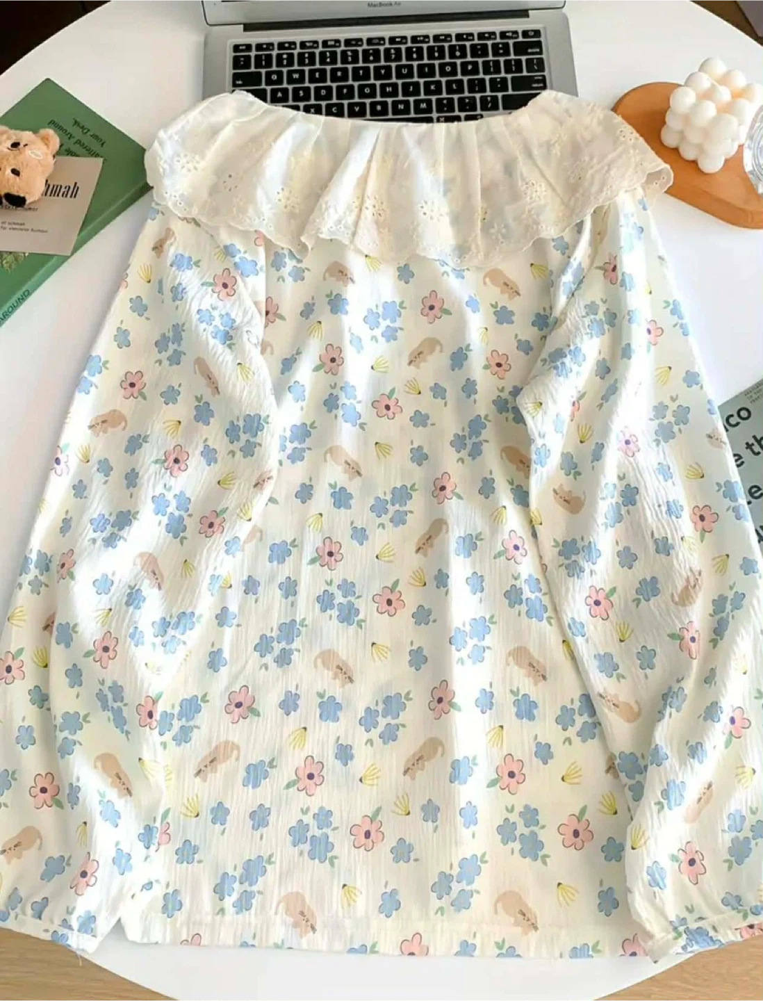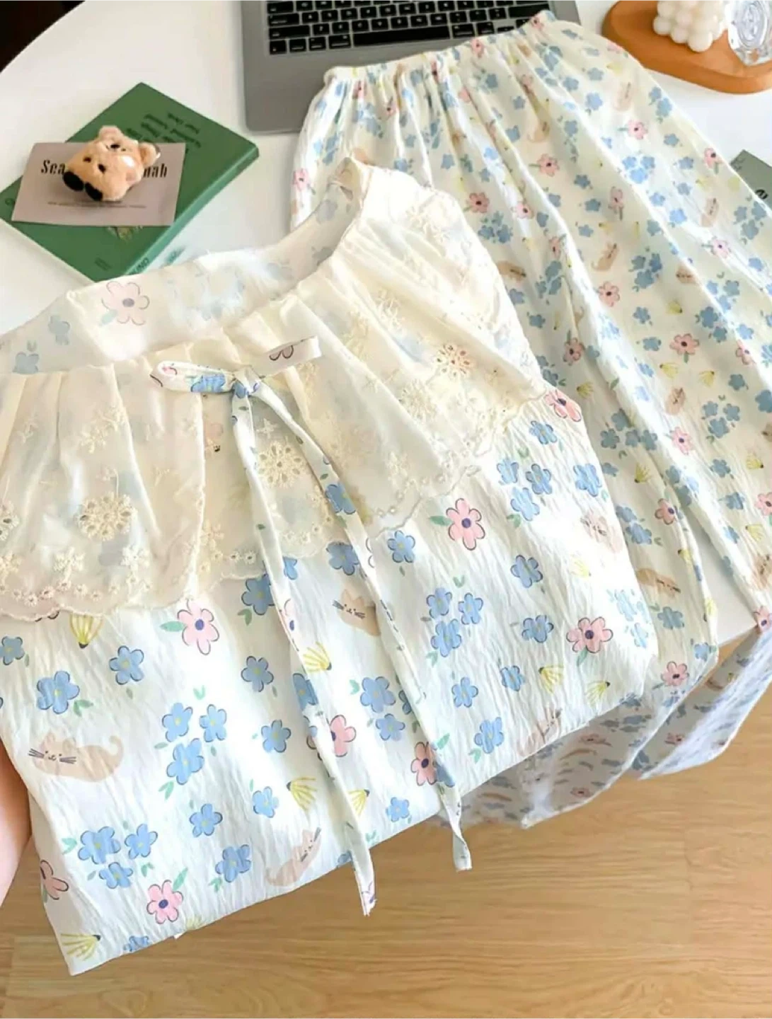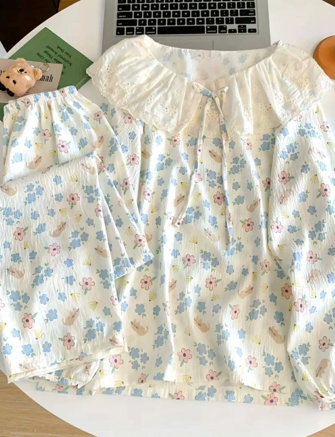 Adorable two-piece pajama set featuring a white background with a cute print of cats, blue flowers, and pink flowers. It includes a long-sleeve top with a ruffled, lace-trimmed collar and matching pants. Perfect for cozy nights!