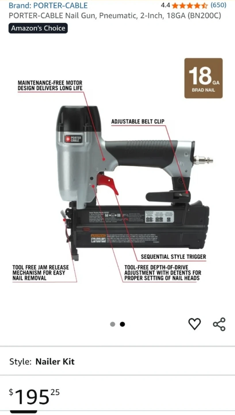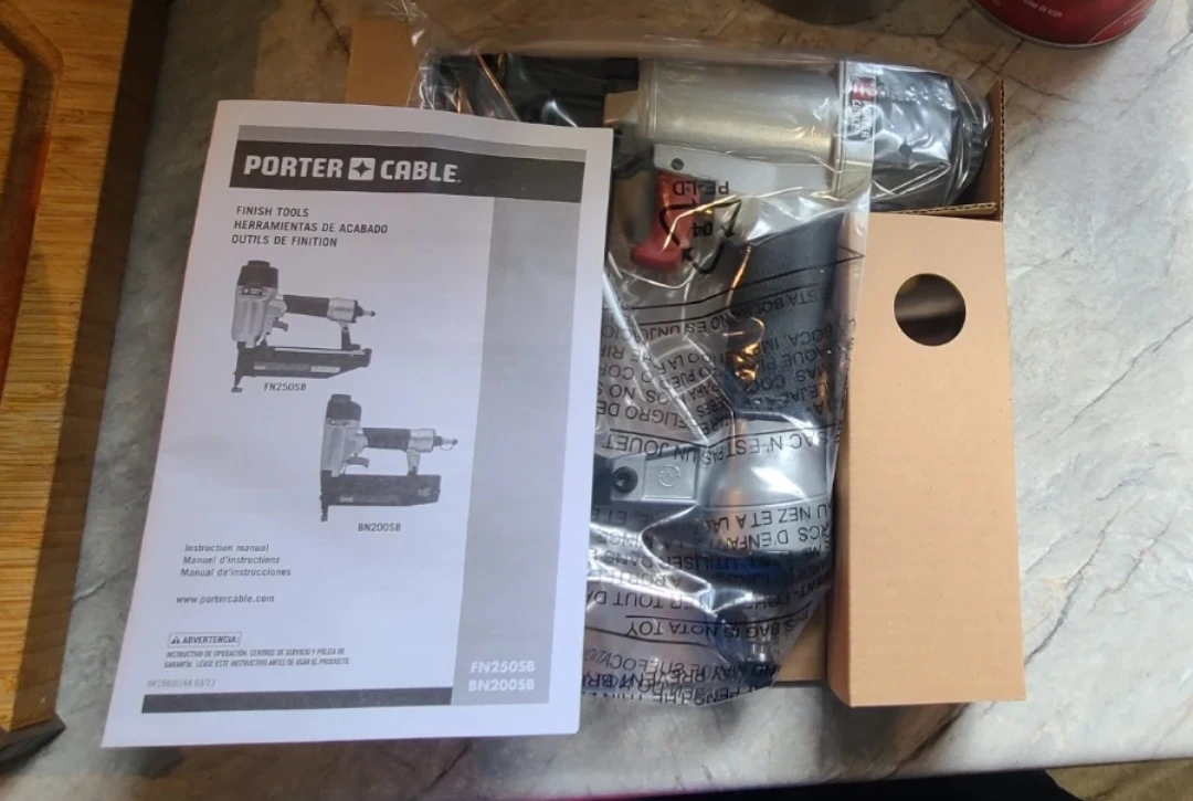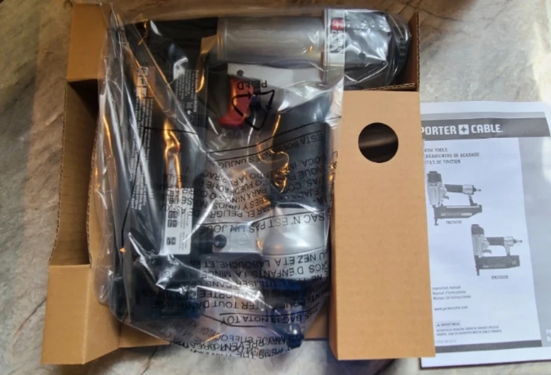 Im selling a bramd new PORTER+CABLE pneumatic nail gun, model BN200C. It's designed for 18 gauge brad nails and features a sequential style trigger. It's great for various DIY and professional woodworking projects. The tool-free jam release mechanism makes for easy nail removal.