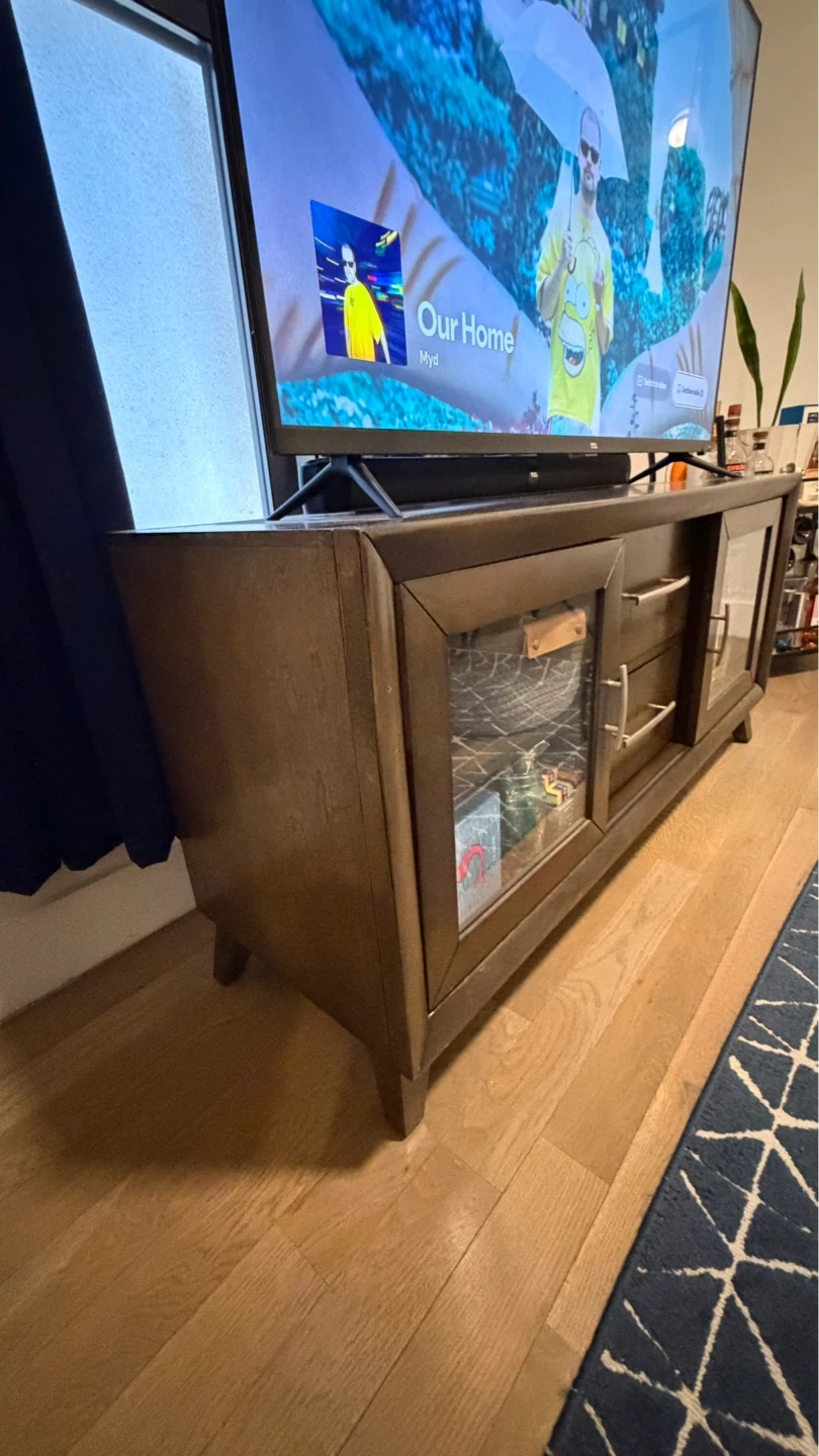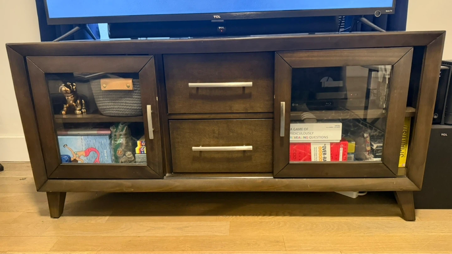 This TV stand is made of rich brown wood and features two glass-paneled doors for display. It has two drawers with silver handles for storage. Its mid-century modern design will complement any living room. Plenty of space for media consoles and accessories!