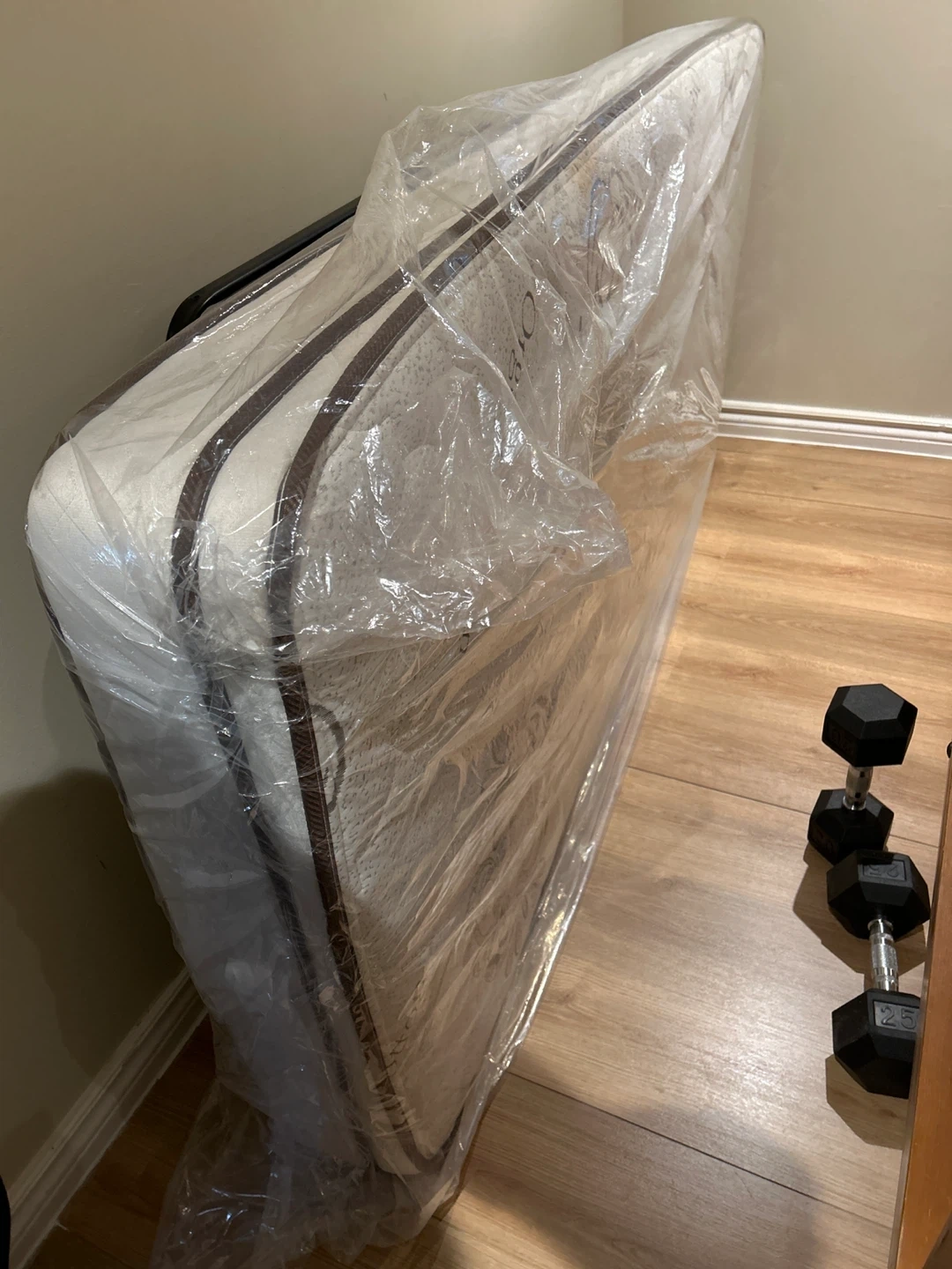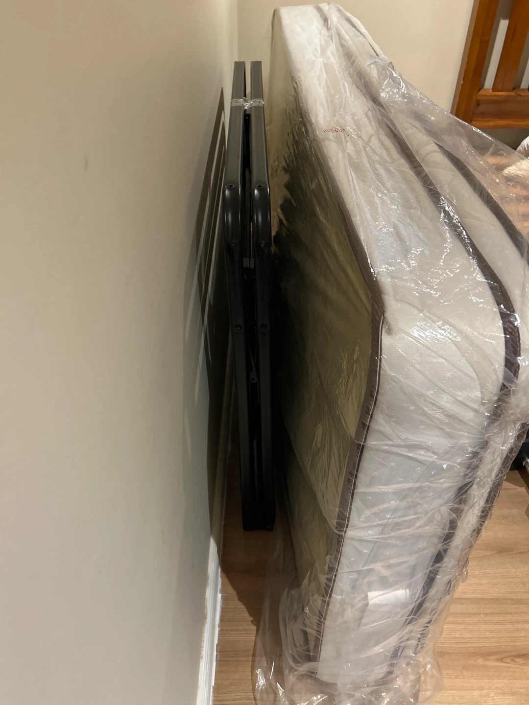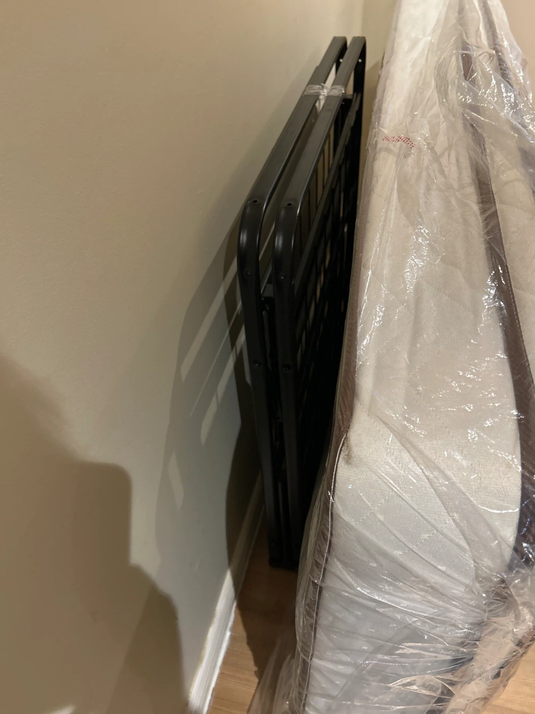 Twin size mattress still in protective plastic. Comes with a folding black metal bed frame. This combo is great for a guest room or a temporary sleeping solution!