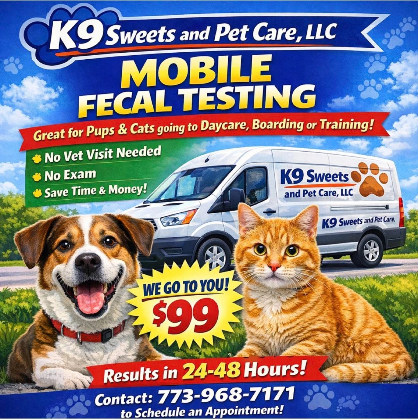 Mobile fecal testing for pups and cats going to daycare, boarding, or training. No vet visit or exam is needed. Results are available in 24-48 hours. Contact to schedule an appointment!