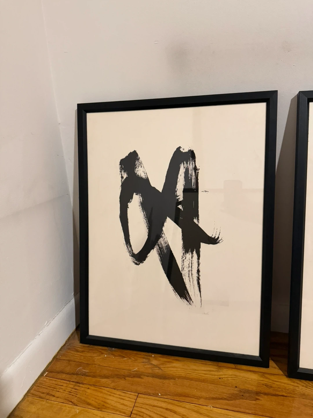This is a framed art print featuring a bold black brushstroke design on a cream background. It's set in a simple black frame.