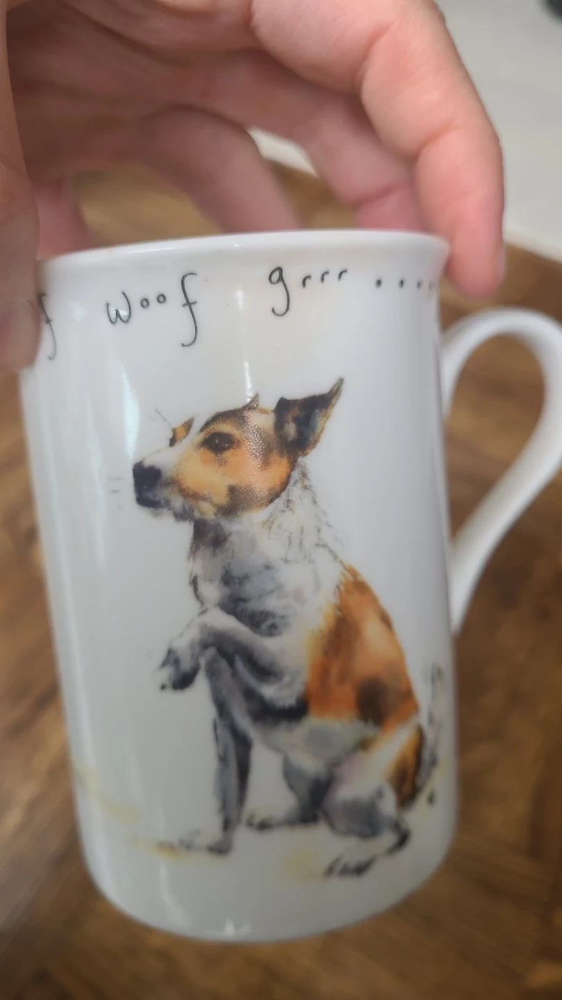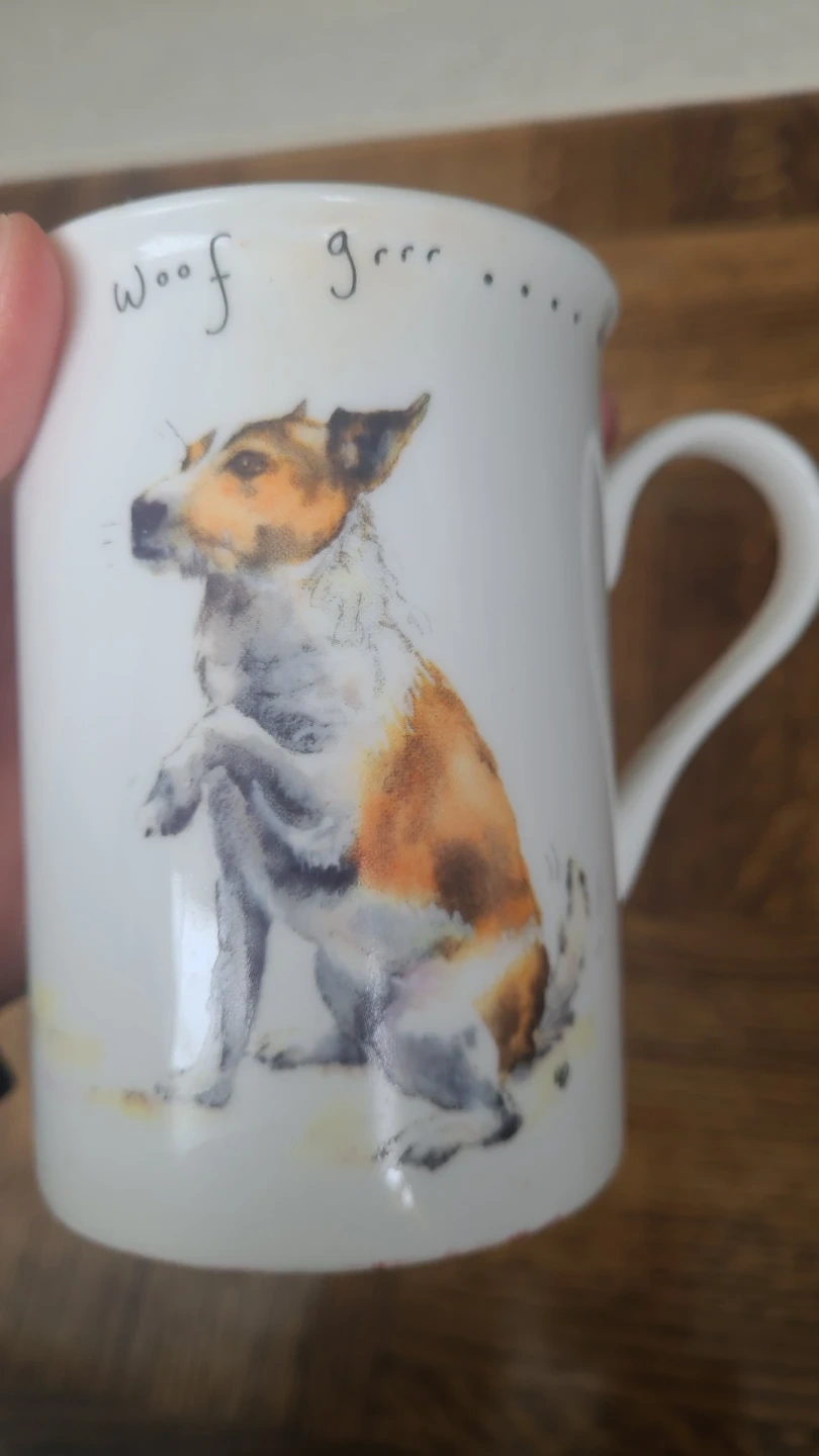 This charming mug features a watercolour-style illustration of a dog. The text "woof grrr" is printed around the rim. It's a fun addition to your morning coffee or tea! Perfect for any dog lover.