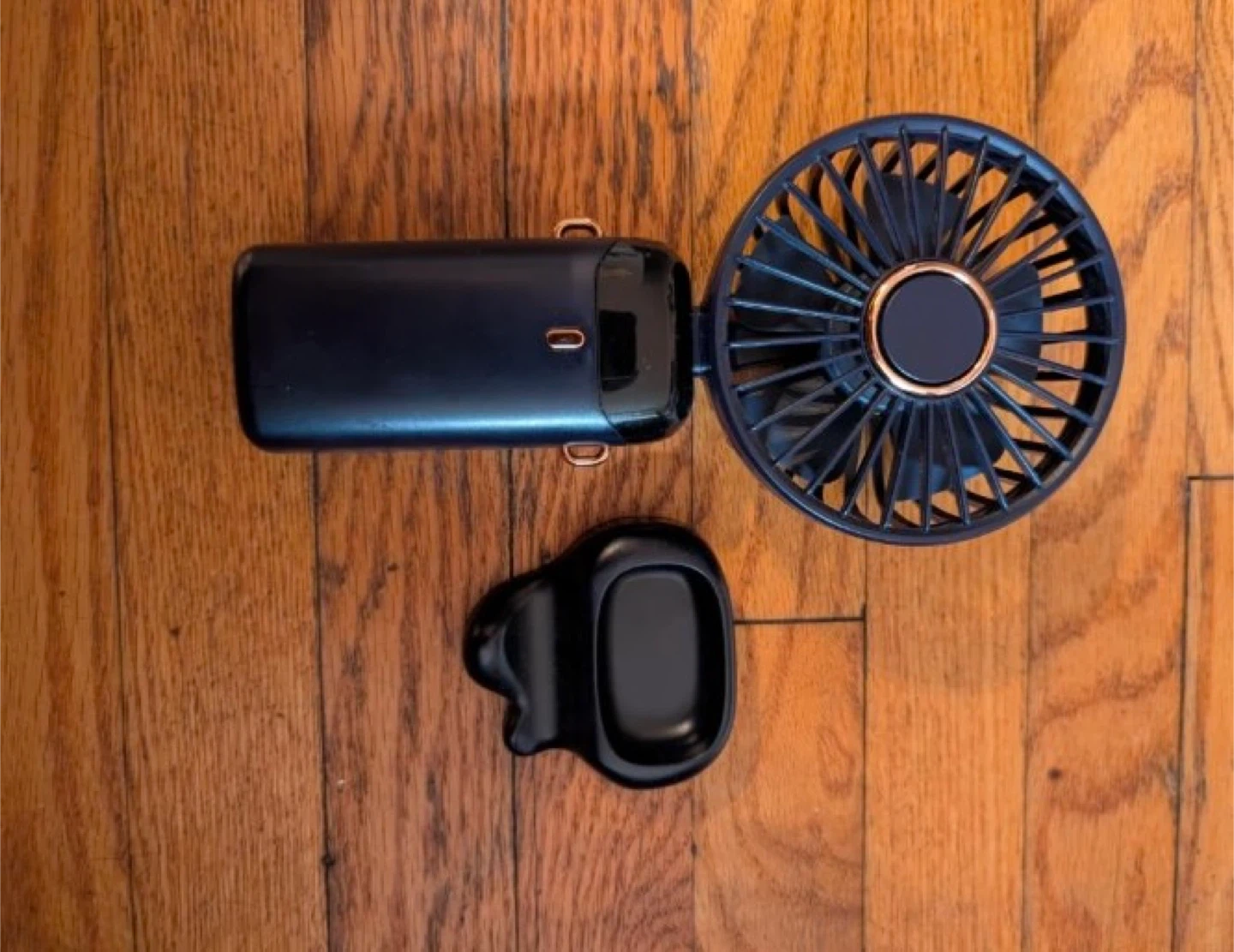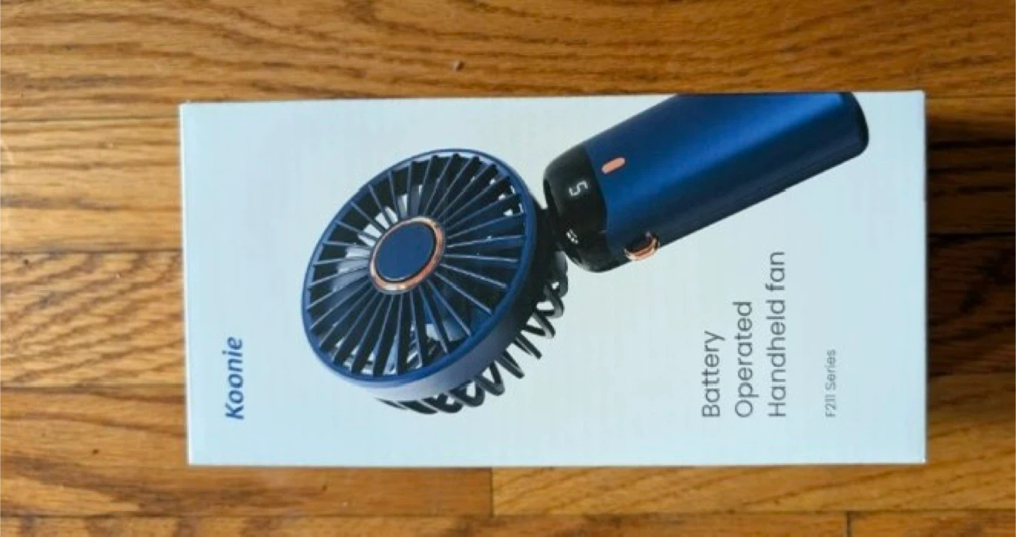 This is a Koonie F211 battery-operated handheld fan. It's black with rose gold accents. Includes a charging base. This fan is portable and great for on-the-go cooling!