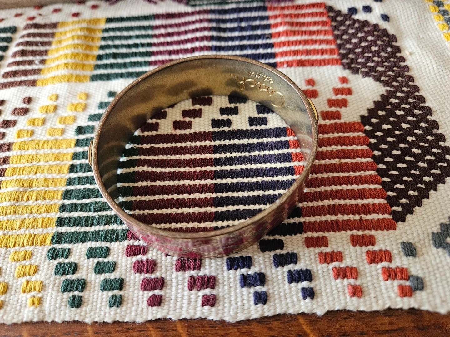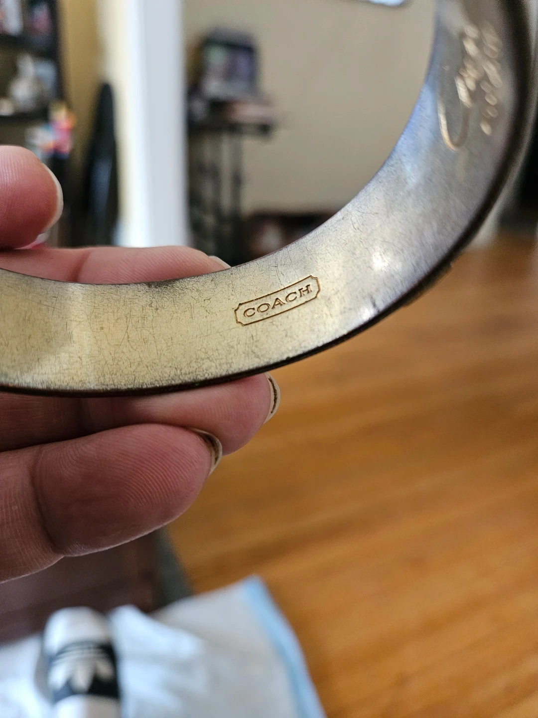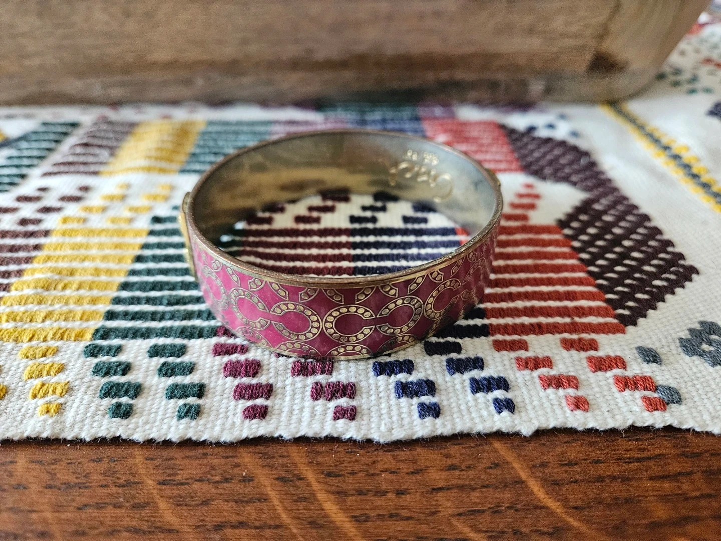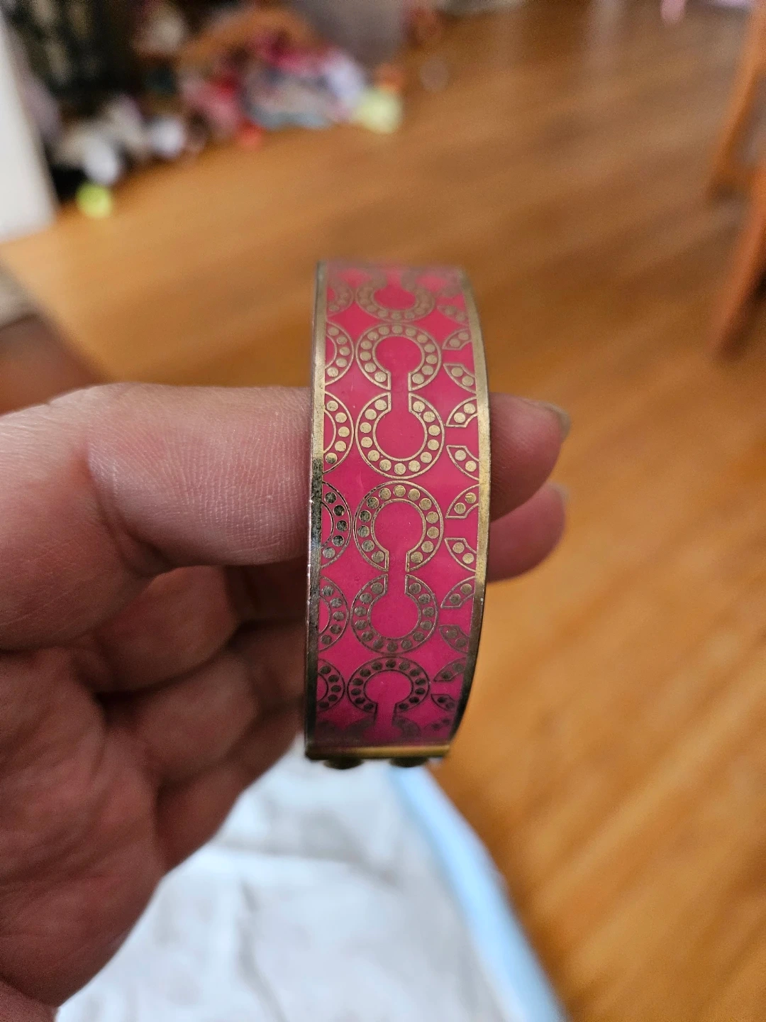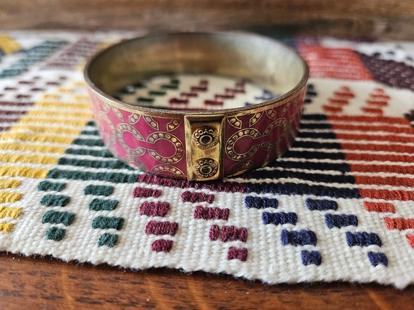 This is a Coach bangle bracelet featuring a pink and gold monogram pattern. It's a cuff-style bracelet with ornate detailing. A classic accessory for any jewelry collection!