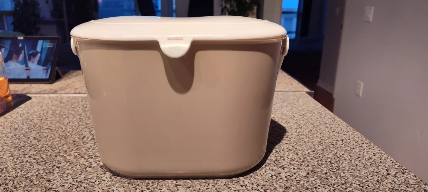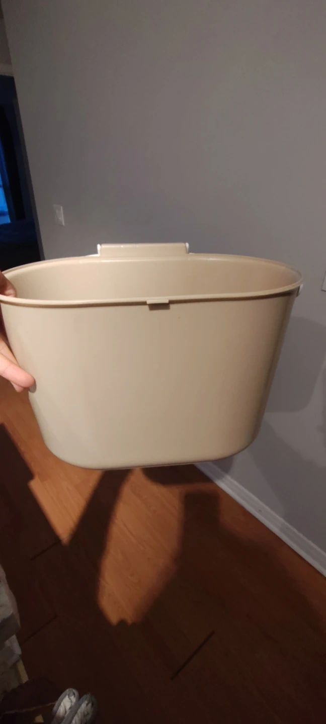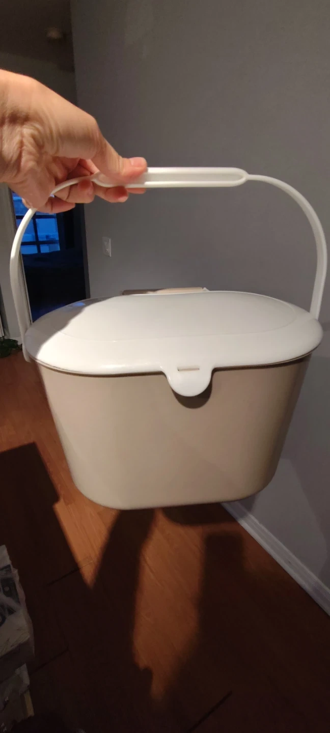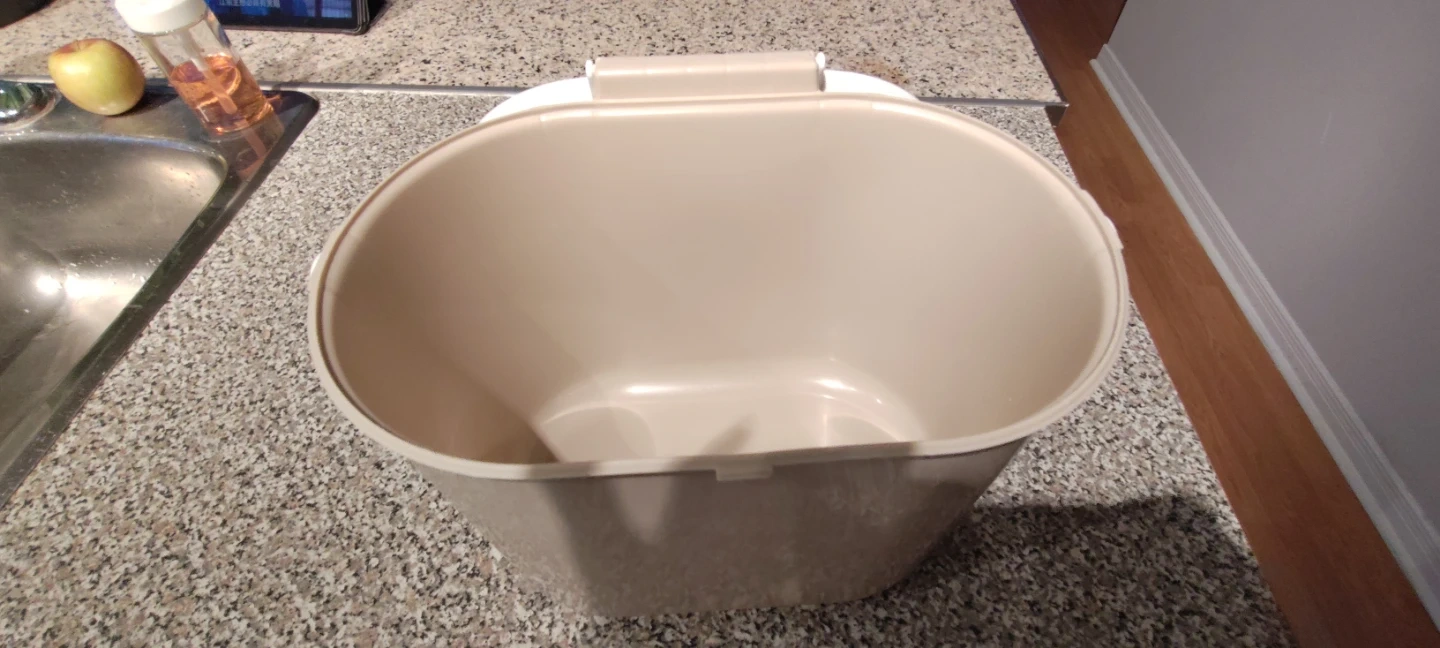 This is a beige plastic bin with a white lid and handle. It's great for storing small items or for use as a compost bin in the kitchen. The bin is made of durable plastic.