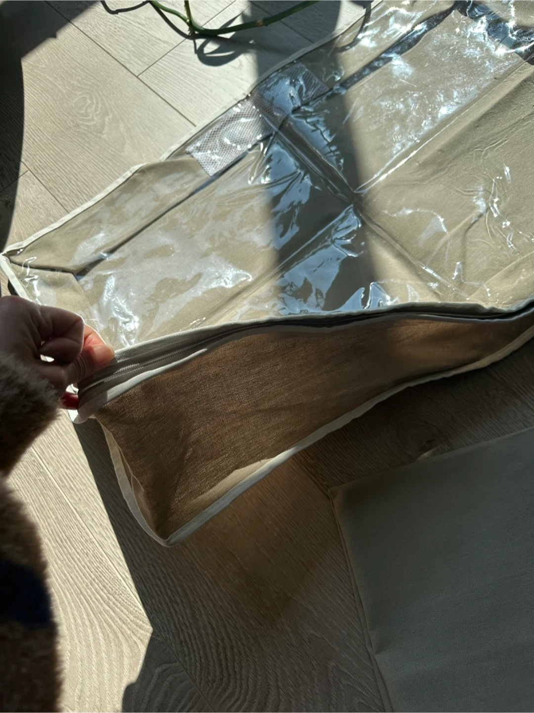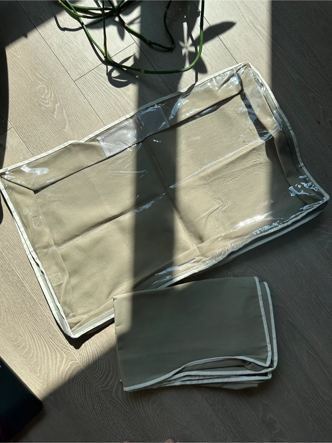 Set of two fabric storage organizer bags with clear plastic tops. Great for organizing clothes or linens. Beige colour with white trim.