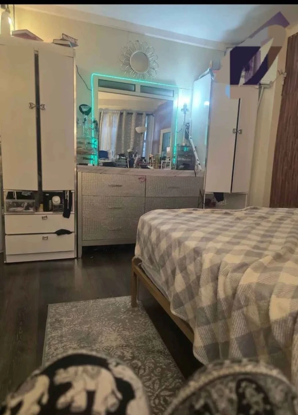 This bedroom set includes two matching wardrobes, a mirrored dresser, and a bed frame. The wardrobes offer ample storage with hanging space and shelves. Dresser features multiple drawers. Mirror is attached to the dresser. All pieces have a silver-toned, textured finish.