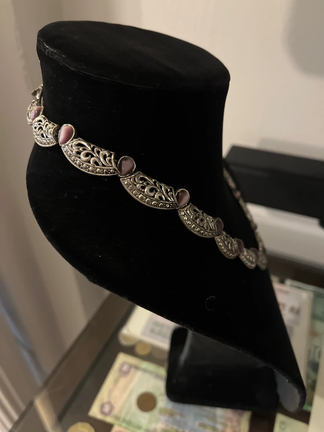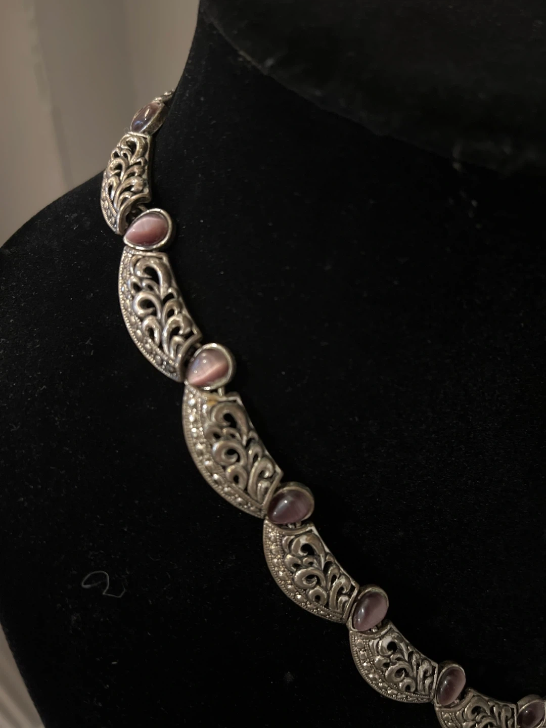 Vintage silver tone statement necklace with purple stones