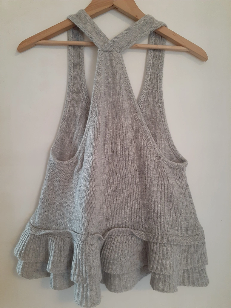 Features a v-neck, button front, and double ruffle hem. Racerback style. Lightweight knit material.