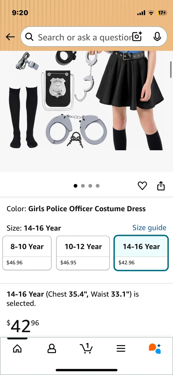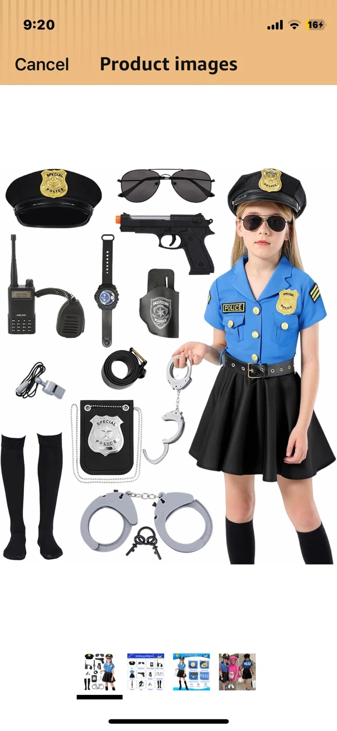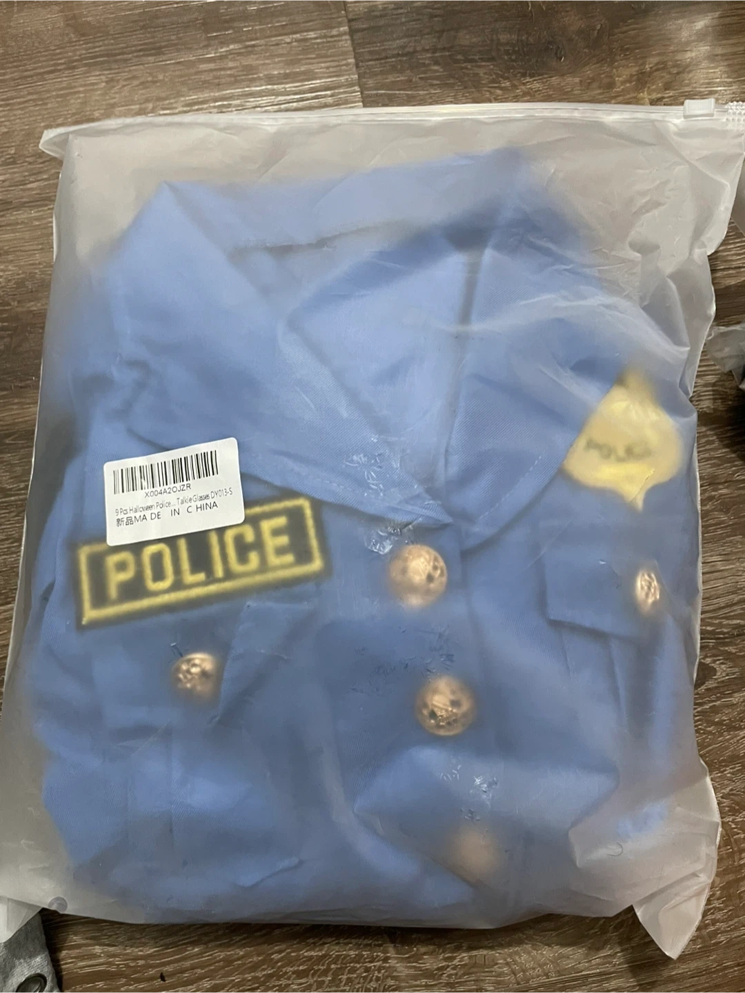 15I have a 9-piece Halloween police costume available. It includes the dress, hat, and accessories. The size is for girls aged 14-16 years. The chest measures 35.4" and the waist is 33.1".