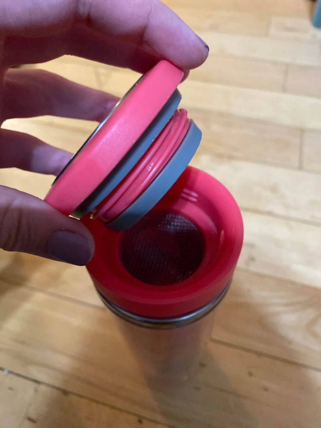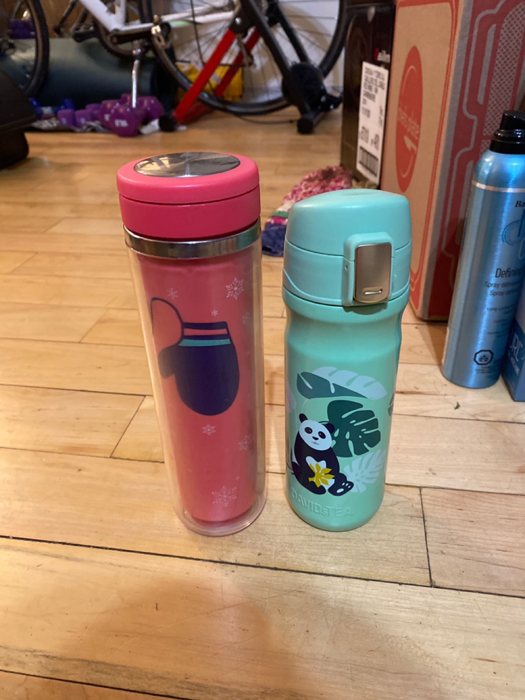 Two David’s tea travel mugs with built in tea filters. The pink one changes colour when hot water is added. Unused, great as a gift.