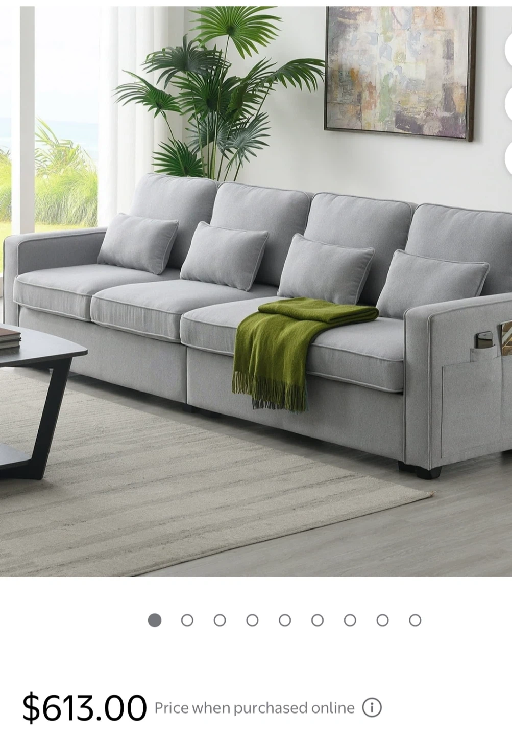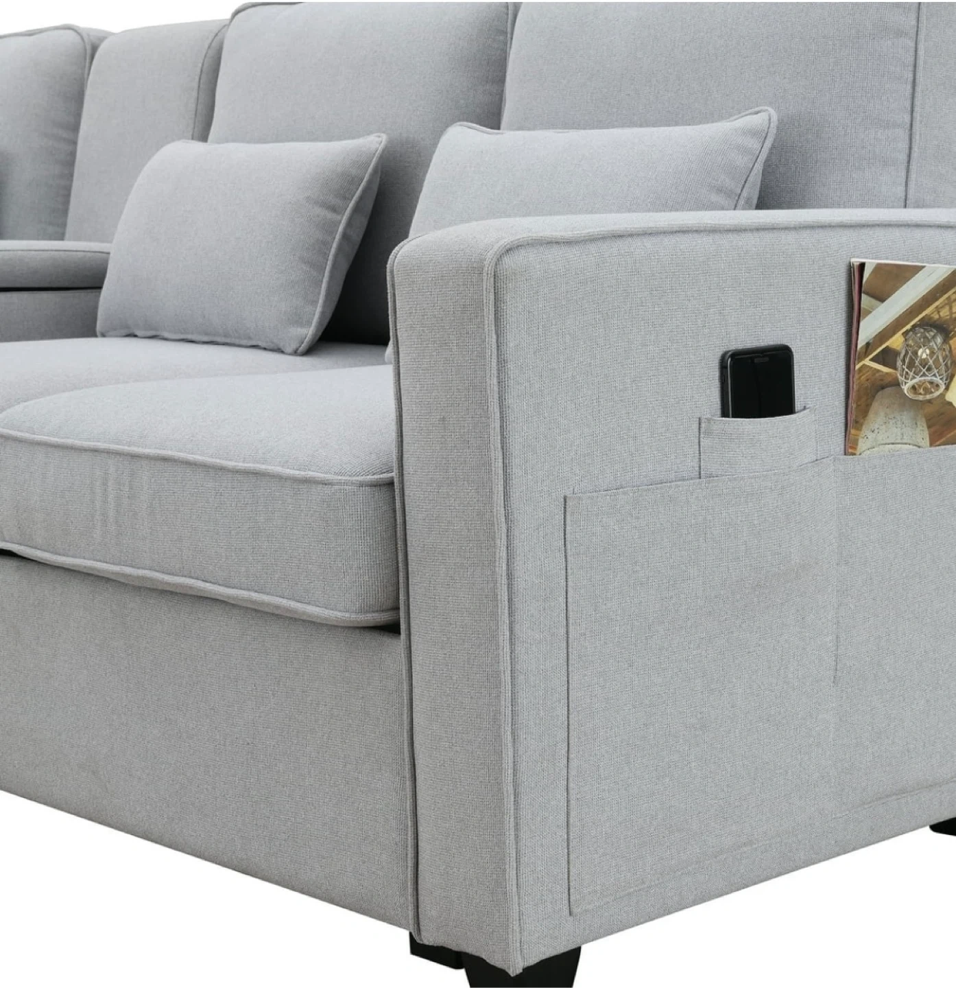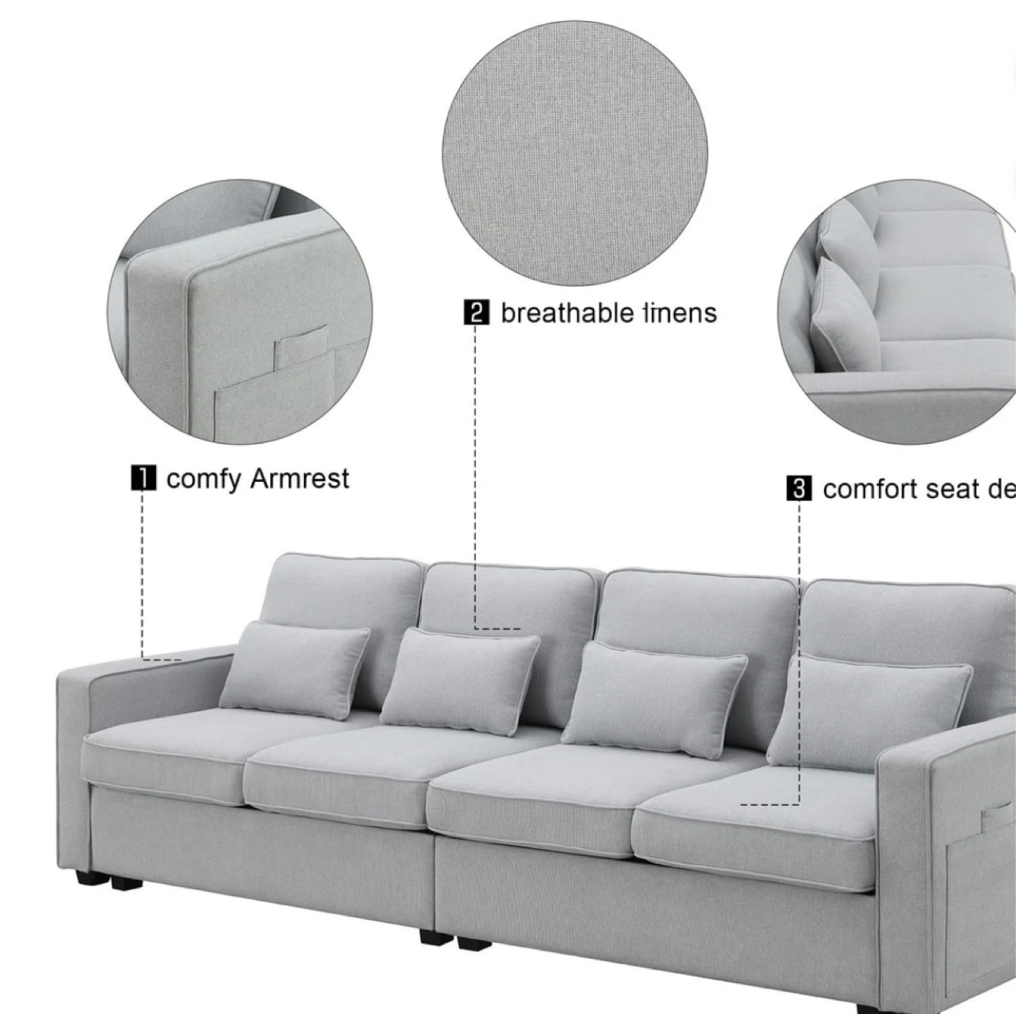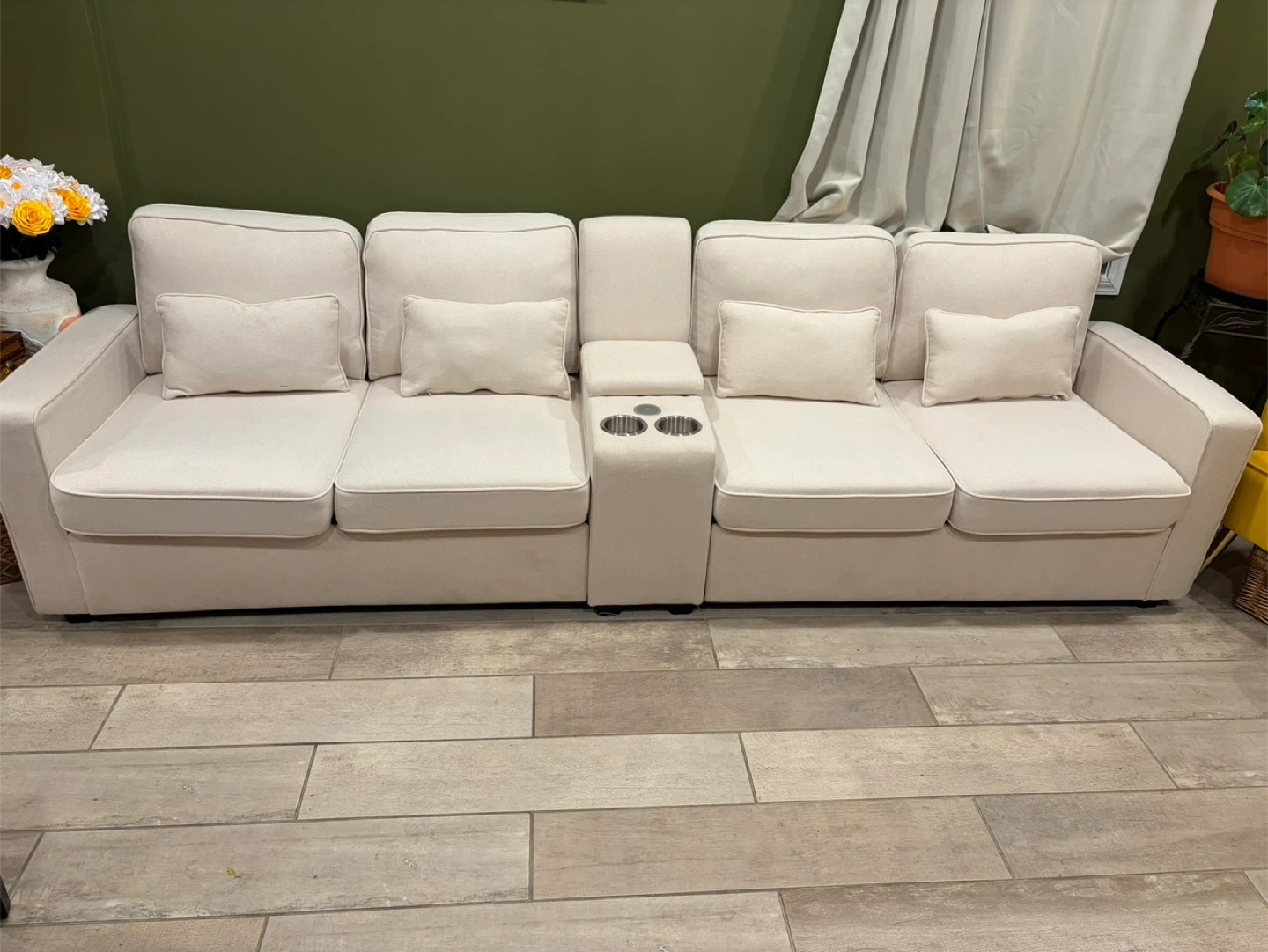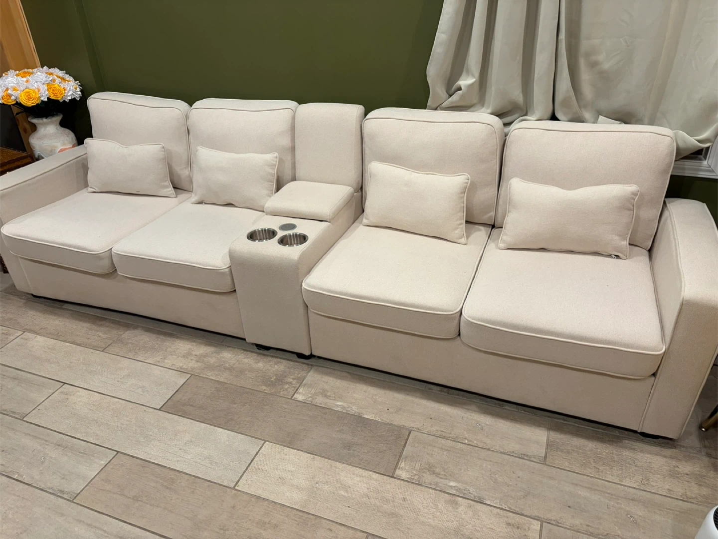 This beige sofa features four seats and a central console with two cup holders. It includes four throw pillows for added comfort. The linen fabric is breathable for a comfortable seating experience.