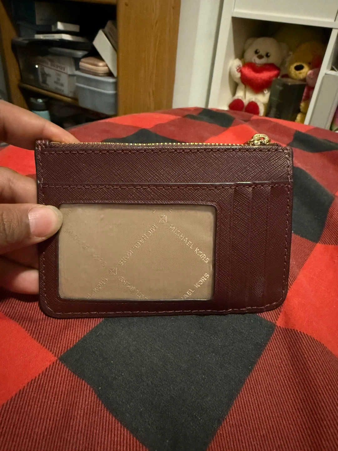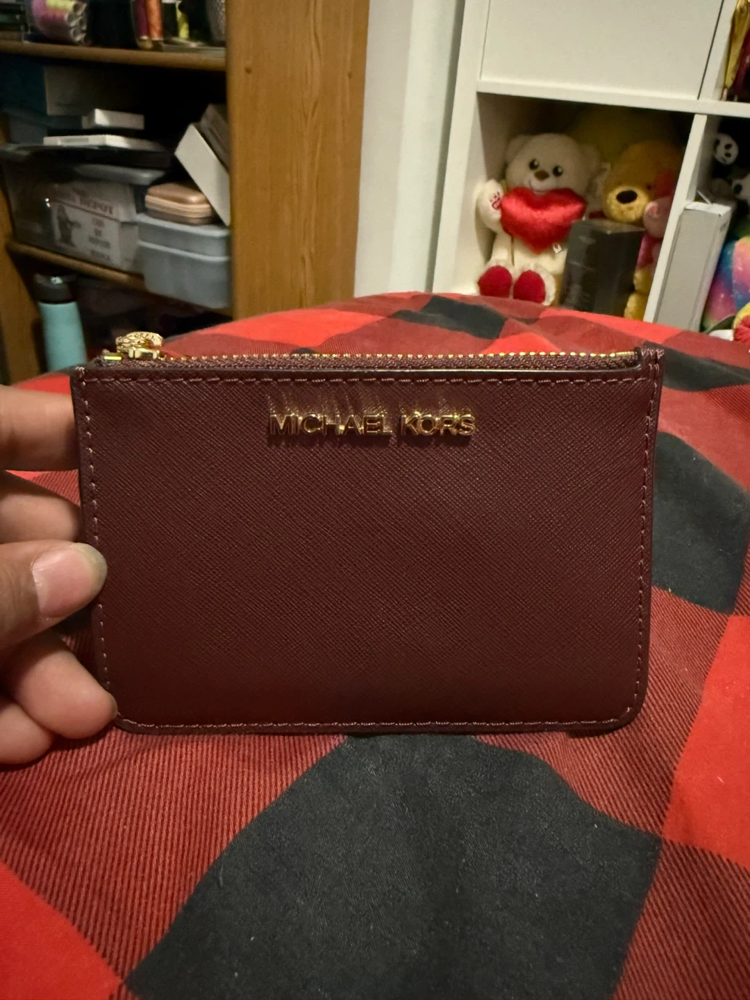 This is a Michael Kors card holder wallet. It's a rich burgundy colour with gold-tone hardware. Plenty of card slots and a zippered compartment for coins or other small items.